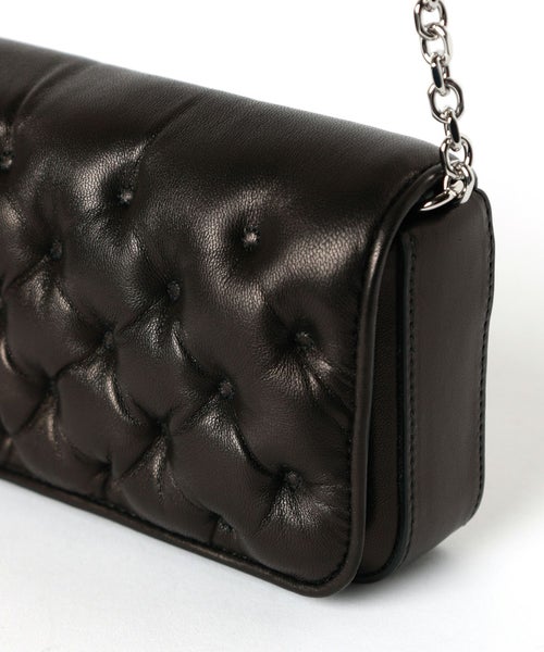 【デザイン】Maison Margiela(メゾンマルジェラ)のバッグ。「グラム スラム」シリーズのミニショルダーバッグは、フランスの伝統的な手縫いキルト「マテラッセ」スタイルを模した独特のキルティングデザインが特徴です。刺繍入りナッパレザーを使用し、上質感とユニークさを両立。取り外し可能なチェーンストラップで、肩掛けからクラッチバッグにもなる2WAY仕様でスタイリングに合わせてアレンジができるのも魅力的。チェーンに付いてるナンバリングロゴのチャームがブランドの象徴的な存在感をプラスしてくれるバッグです。