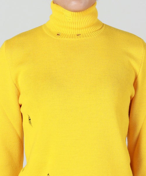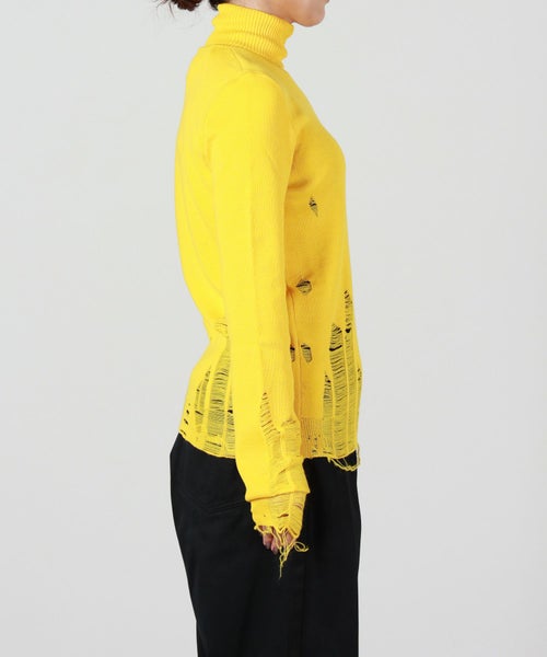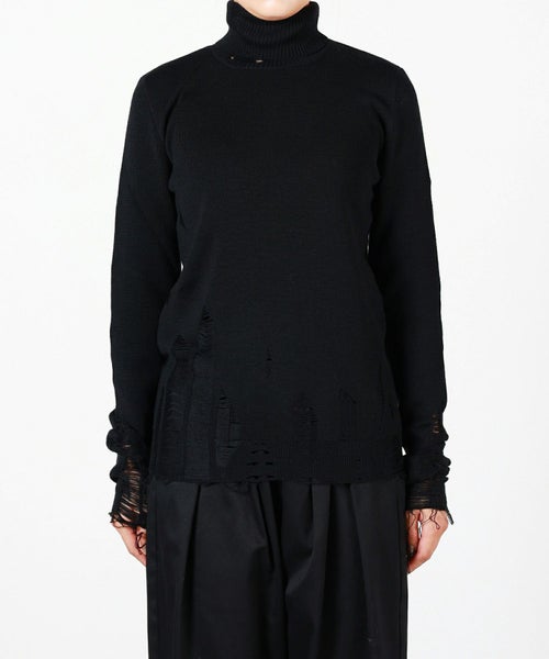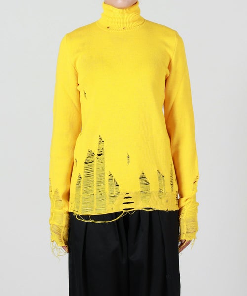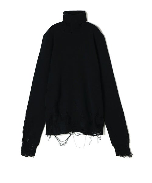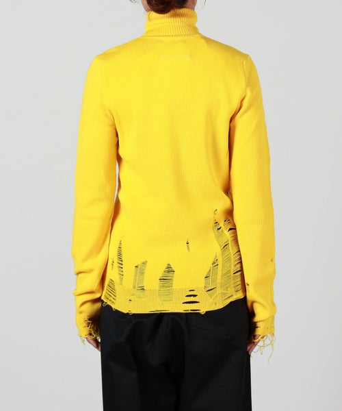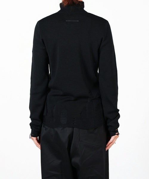 【デザイン】MM6 Maison Margiela(エムエムシックス メゾン マルジェラ)のニット。露出した縫い目、リブ編みのトリム、破れたディテールが特徴で、MM6のニットウェアへのアプローチを反映しています。バックには、控えめながらはっきりとしたブランドのシグネチャー、1本の白いステッチのラインが施されています。