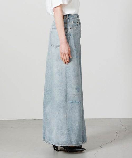 【素材】綿100%のデニム生地で仕立てられており、柔らかさと程よいコシを持ちます。ディストレスト加工が施されているため、部分的に色落ちやダメージがあり、履き込むほどに表情を変えていき、独自の風合いを楽しむことができます。