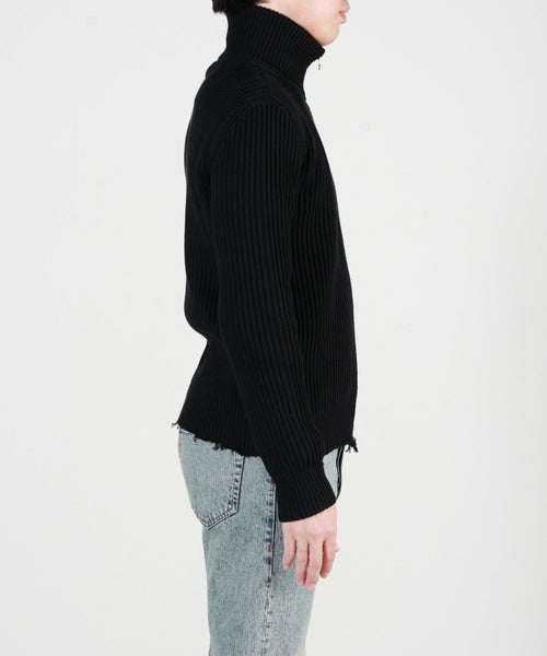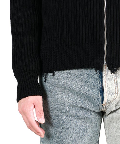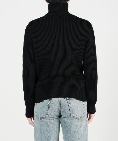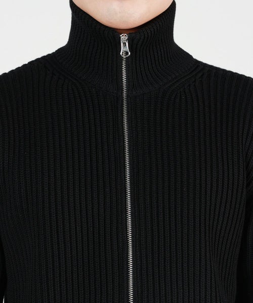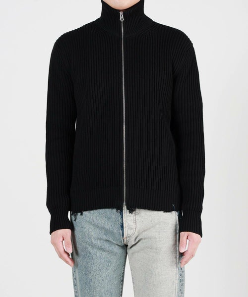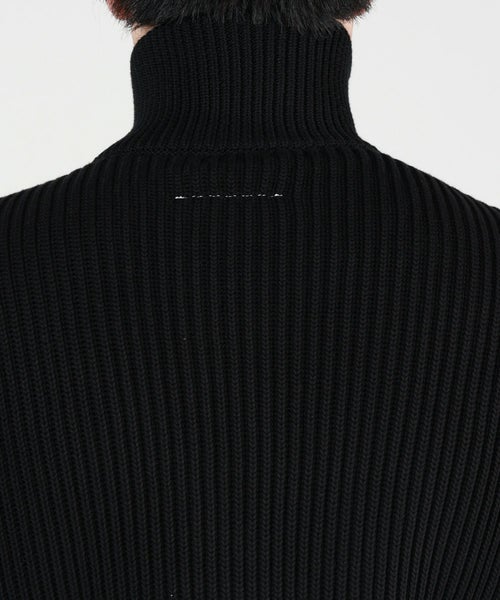 【デザイン】MM6 Maison Margiela(エムエムシックス メゾン マルジェラ)のメンズのニット。スッキリとしたフィットにデザインされた、リブ編みのカミオヌール風スポーツジャケットです。コットン混紡素材で、ハイネックのジッパー開閉。裾は切りっぱなし。バックには、控えめながらはっきりとしたMM6のシグネチャー、1本の白いステッチのラインがあしらわれています。