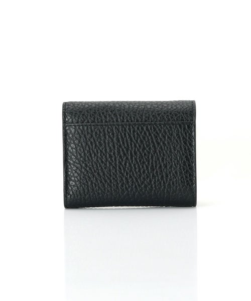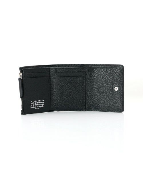 【デザイン】 Maison Margiela(メゾンマルジェラ)の財布。エンボス加工を施したグレイニー カーフレザーを使用した、洗練された三つ折り財布です。こちらは一番人気のブラックのお色です。フロントにはブランドを象徴するシグネチャーの4ステッチを配置し、控えめながらも個性を主張します。スナップボタン開閉で使いやすく、内側には4つのカードスロット、フラットポケット、ジップポケットを備えた機能的なデザイン。ユニセックスでお使いいただけるため、ギフトとしても人気の高いアイテムです。