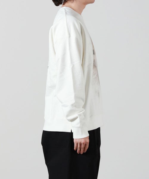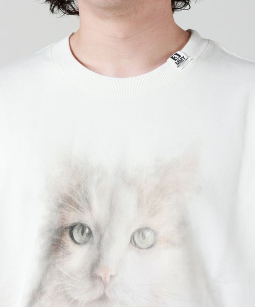 【デザイン】Maison MIHARA YASUHIRO(メゾンミハラヤスヒロ)のスウェット。 フロントに大胆にプリントされたキャットモチーフが印象的なスウェットシャツです。バックにはコレクションテーマである「A Little Paradox Part Six」のテキストを配し、アート性とメッセージ性を融合させた一着。クルーネックのベーシックなシルエットながら、左袖口に施されたブランドオリジナルの刺繍ワッペンがアクセントに。ユーモアと哲学を共存させた、Maison MIHARA YASUHIROらしい遊び心にあふれたデザインです。