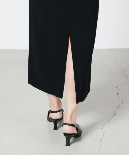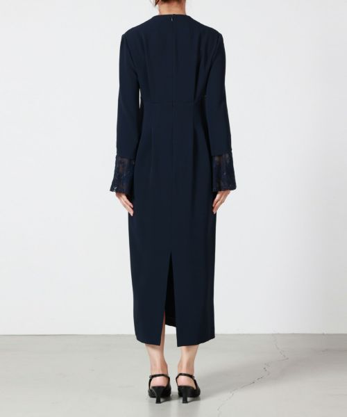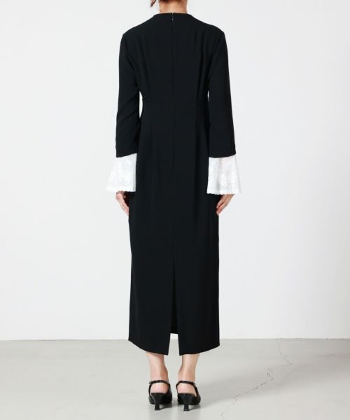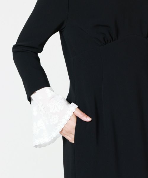 【デザイン】Mame Kurogouchi(マメ クロゴウチ)のワンピース。裾のスリットがセンシュアルなアクセントを添え、高めのウエストマークで縦のラインを強調。袖のレースカフスは手元を美しく魅せ、取り外し可能で着用シーンに応じてスタイルを変えられる1着です。ゆったりとしたシルエットながら、縦のラインを意識したデザインでスタイルアップ効果も期待できます。