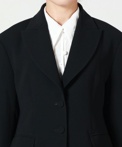 【デザイン】Mame Kurogouchi(マメ クロゴウチ)のジャケット。 ボナパルトカラーのような小ぶりなラペルが特徴のスーツジャケットで、ミニマルかつ繊細なカッティングが美しい一着です。やや長めに設定した着丈と袖丈がマスキュリンな印象を演出し、上品で力強いシルエットを実現。シーズンレスなデザインで、フォーマルからオフィススタイルまで幅広く活躍します。アイコニックなスーツスタイルを作り出す、洗練されたデザインです。