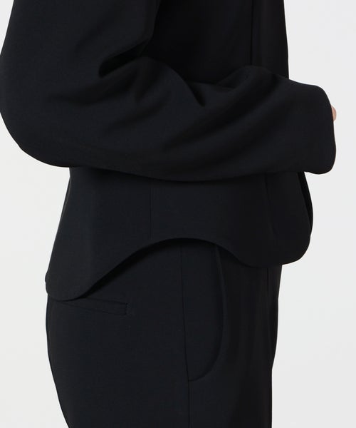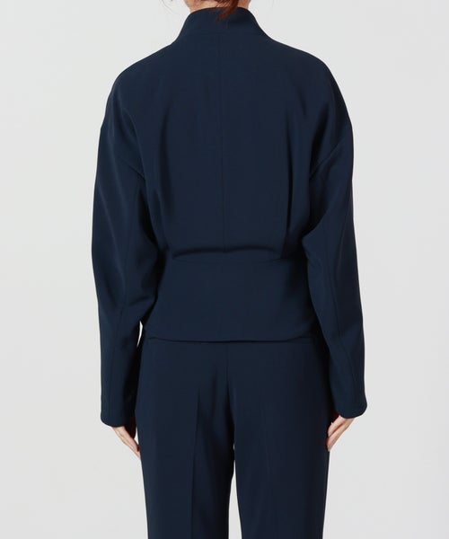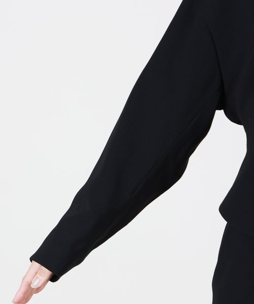 【素材】 トリアセテートとポリエステルをブレンドした特殊仮撚加工糸を使用。シルクのような滑らかなタッチと上品な光沢、豊かな膨らみが特徴で、深みのある発色と清涼感を兼ね備えています。ドレープ性に優れ、美しい落ち感がシルエットに柔らかな陰影を与えます。適度なハリ感もあり、構築的なフォルムを美しくキープ。裏地にはポリエステルを採用し、滑らかな着心地と着脱のしやすさにも配慮。軽やかさと構築的な表情を両立した、上質な素材使いが魅力です。