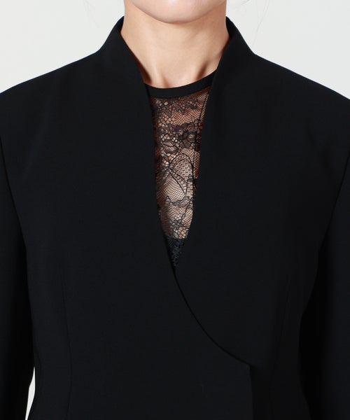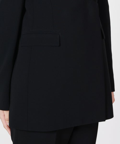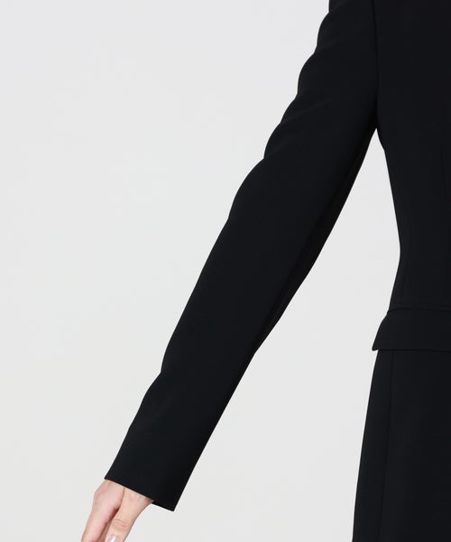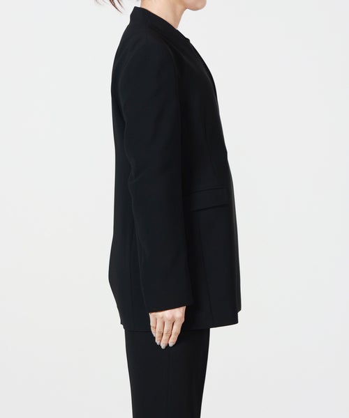 【素材】 トリアセテートとポリエステルの特殊仮撚加工糸を用いた平二重組織の生地を使用。シルキーで滑らかなタッチと豊かな厚みが特徴で、上品な光沢と美しい落ち感を兼ね備えています。ストレッチ性を備えながらシワになりにくく、イージーケア性にも優れた機能素材で、日常使いにも適した実用性の高い仕上がりです。裏地にはポリエステルを採用し、滑らかな袖通しと快適な着心地を実現しています。