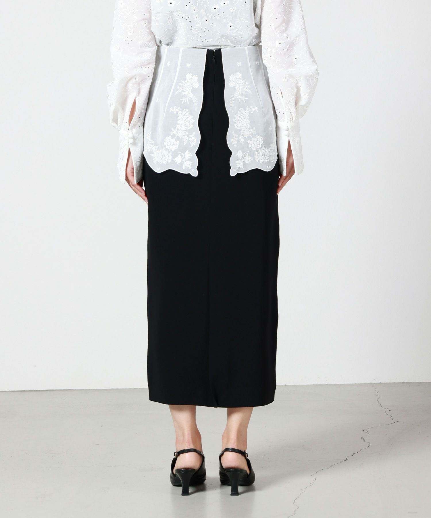 【デザイン】Mame Kurogouchi(マメ クロゴウチ)のスカート。トリアセテートとポリエステルのジョーゼットを使用した、上品で構築的なペプラムスカートです。ハイウエストのデザインが腰位置を高く見せ、縦のラインを強調。すっきりとしたペンシルシルエットが女性らしいメリハリを生み出します。オーガンジー生地に繊細な刺繍を施したペプラムは、Mame Kurogouchiオリジナルの花柄レース。取り外しが可能な2WAY仕様で、華やかなシーンではレースを重ねて印象的に、シンプルに着たい日はペンシルスカートとしてミニマルに。シーンや気分に合わせて自在にスタイリングを楽しめる一着です。