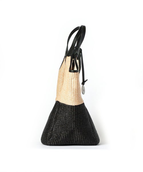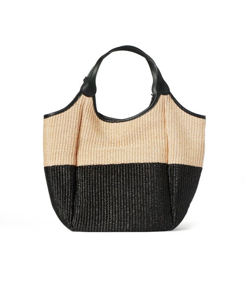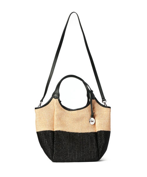 【デザイン】MARCO MASI(マルコマージ)のかごバッグ。ツートーンカラーが特徴的なデザイン。レザーハンドルのラフィアバッグは、たっぷりと荷物を収納できるサイズ感で、デザイン性と機能性を併せ持ったアイテムです。 広めのマチで収納力があり、荷物が多い日のお出かけにも便利です。 ナチュラルコーデやリゾートスタイルにぴったりのアイテムです。