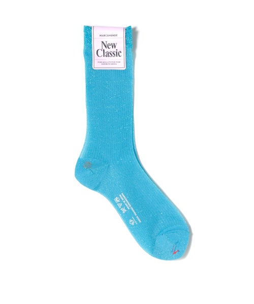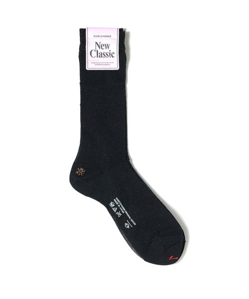 【デザイン】 MARCOMONDE(マルコモンド)の靴下。程よいラメ感にしっかり透け感があるソックス。クシュっと履いたり伸ばして履いたり合わせる洋服や靴によってアレンジが楽しめます。
