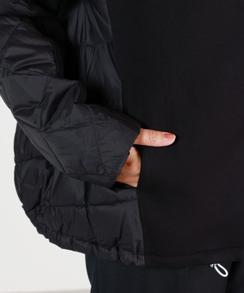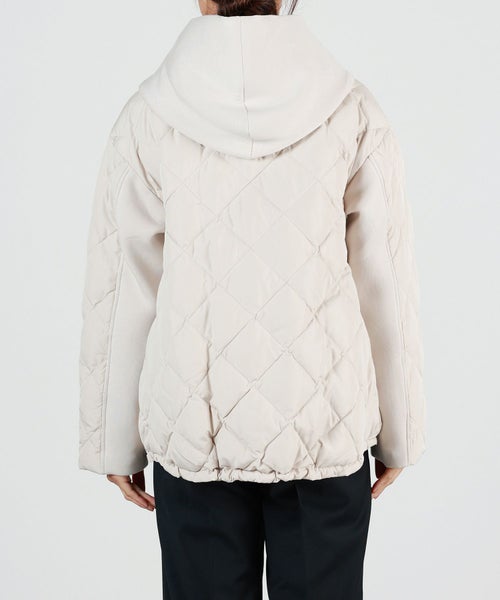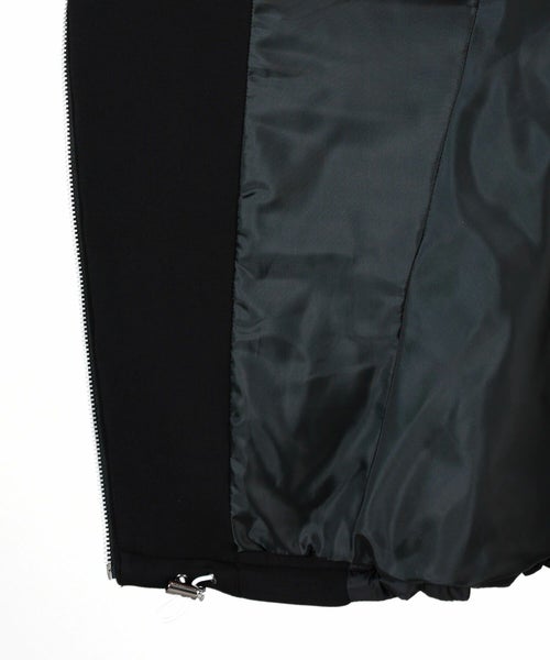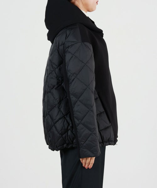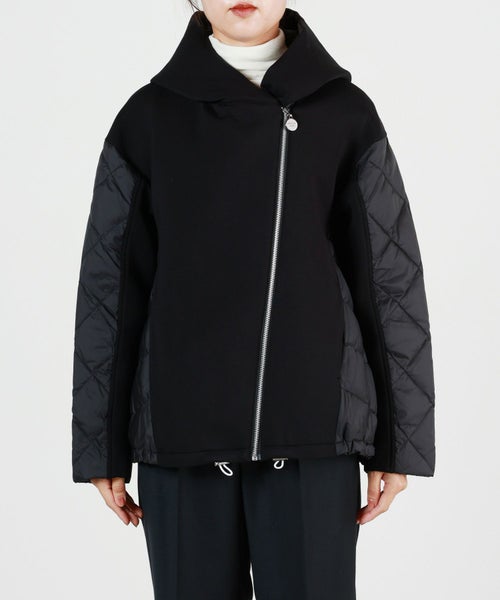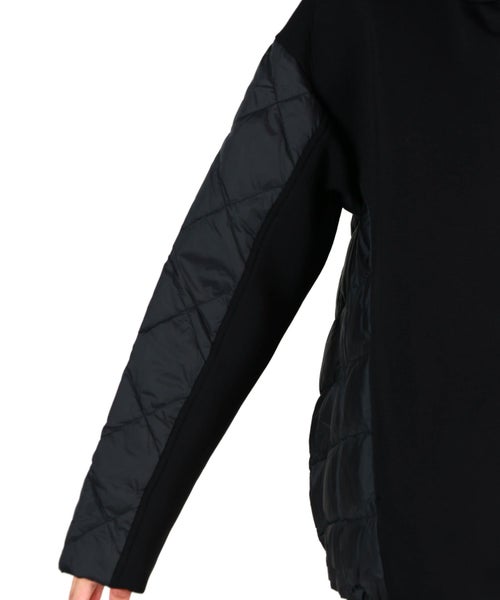 素材感 : 2枚の生地を段ボールのような断面でつなぎ合わせ生地と生地の間に蓄熱性が生まれ、軽くて暖かい素材として重宝されているダンボールニット素材とキルティングの切り替えデザイン。