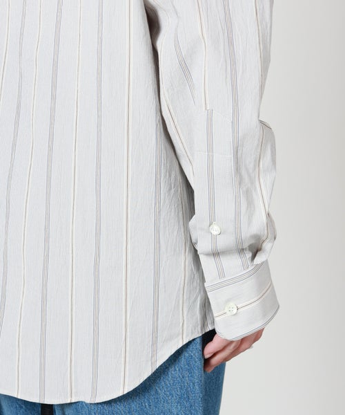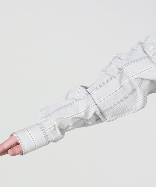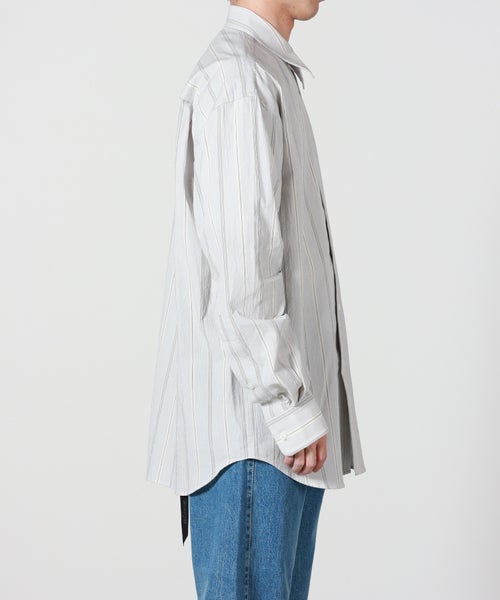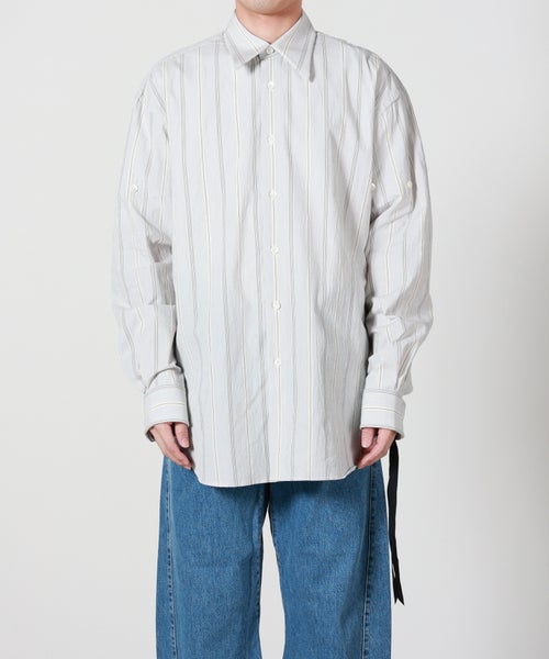 【デザイン】MARINA YEE(マリナ イー)のシャツ。ミニマルながらも個性を感じさせる一枚。ドロップショルダーがリラックスした印象を与えつつ、袖にボタンを配置し、シルエットの変化とデザイン性を両立。さらに、ストラップディテールがアクセントとなり、シンプルな中にブランドらしい遊び心を感じさせます。