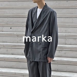 デザイナー石川俊介が手がけるmarkaは、都会的なエッセンスを注入したMARKAWAREのカジュアルライン。60年代~70年代のカウンターカルチャーをベースにした、現在失われてしまった男性像の追求。素材選びから、縫製、加工に至るまで、洋服作りにおけるすべてのアプローチを日本国内で行う。ブランドタグの「日の丸」モチーフは日本製品へのこだわりを表現している。マーカのブランド名の由来は「karma(カルマ)」を単語の文字列を並び替えるたアナグラム、また「mark」と「a」という二つの英単語の組み合わせて様々な意味を含ませたもの。
