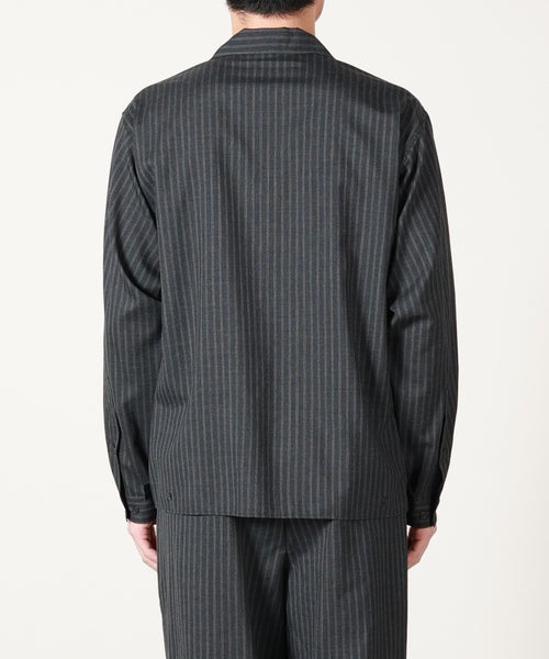 【デザイン】marka(マーカ)のシャツ。大きめのオープンカラー、フロントのダブルポケット、裾の両脇に施されたアジャスターが特徴の一着です。肩幅はレギュラーフィットですが、身頃はゆったりした着心地の良いバランス。第1ボタンを留めた場合でもレギュラーカラーのような雰囲気で着用できるよう、一番上は貝ボタンが付いております。ワッシャータンブラー加工を施したウールトロピカルは、細かな皺が入りカジュアルな着こなしもしやすくなっています。ボックスシルエットに設定してあるので、暑い時期でも羽織としてブルゾンライクな雰囲気で着用でき、スタイリングの幅が広いのも魅力的なポイントです。同素材のジャケット・パンツとのスタイリングが可能です。
