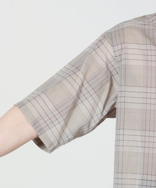 【素材】綿100%のオーガニックコットンローン生地を使用。60番手の強撚糸で織り上げることで、肌に触れた瞬間に感じるさらりとしたドライタッチと、軽やかな清涼感が特徴です。薄手でありながらも極端な頼りなさはなく、風をはらむような柔らかな落ち感と自然なシアー感が、夏らしい軽快な表情を生み出します。見た目にも涼しげで、汗ばむ季節でも肌離れが良く快適に着用いただける素材です。洗いを重ねることでさらに馴染み、風合いの変化も楽しめます。