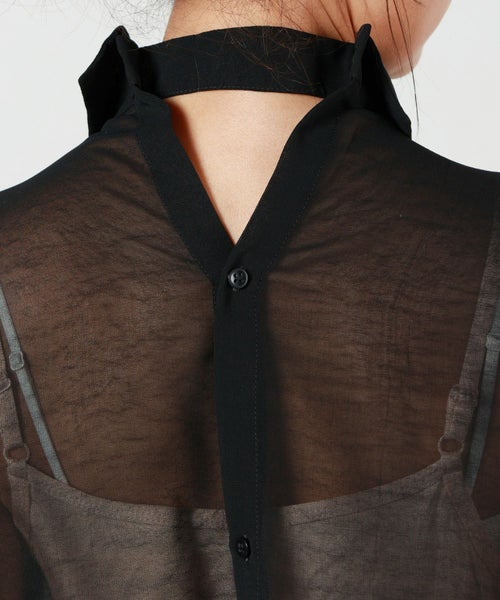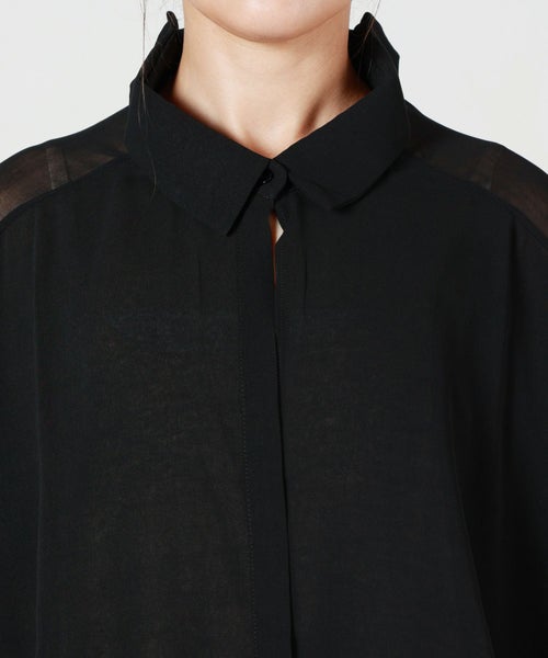 【デザイン】Miki MIALY(ミキミアリ)のシャツ。 計算されたシルエットと洗練されたディテールが魅力の一着。端正な襟元とボタン配置、わずかにゆとりを持たせたボディラインが、上品さと抜け感を両立します。フォーマルな装いはもちろん、デニムやスラックスと合わせたカジュアルダウンにも対応可能。シンプルながらも存在感を放ち、タイムレスなスタイルを演出します。