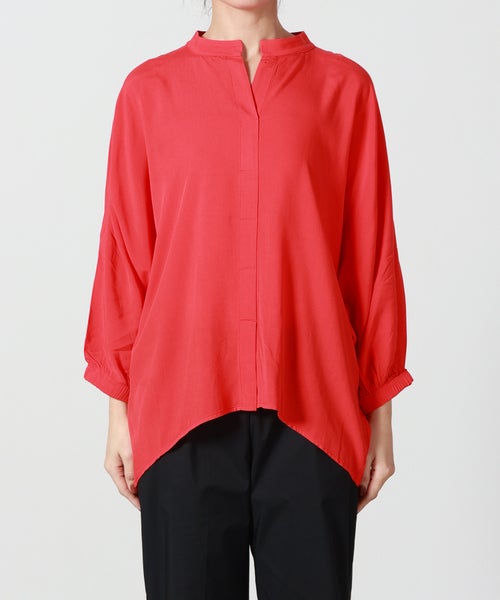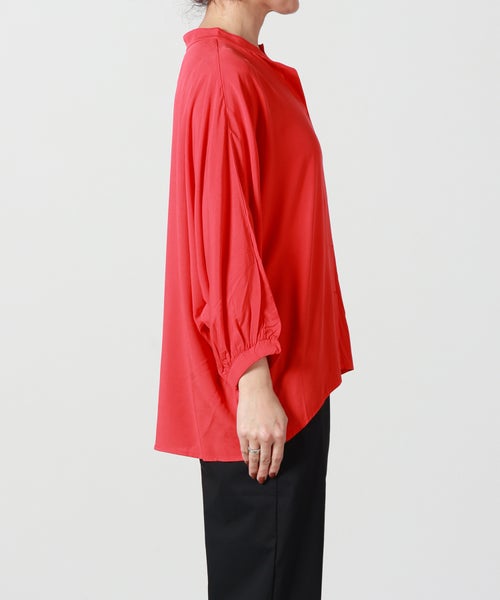 【デザイン】Miki MIALY(ミキミアリ)のシャツ。レーヨンの落ち感を活かした、軽やかで洗練された印象を与えます。肩のラインが決まっていないドルマンスリーブに袖口はゴム仕様で、気分や体型に合わせて自然に馴染むのも魅力です。たっぷりと布を使い生じるドレープが自然に女性らしさを際立たせます。パンツにもスカートにも合わせやすく、汎用性の高いアイテムで、オンオフ問わず活躍します。