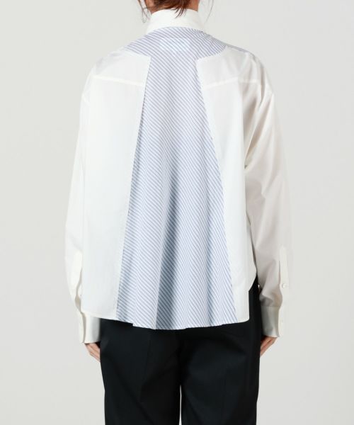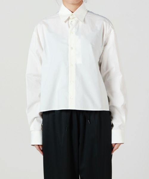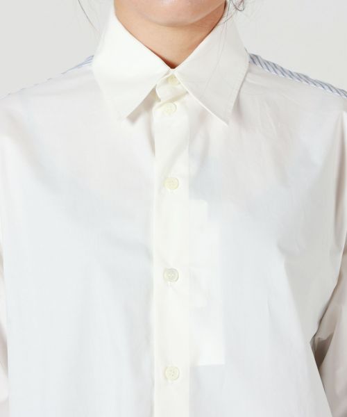 【デザイン】MM6 Maison Margiela(エムエムシックス メゾン マルジェラ)のシャツ。シンプルなホワイトを基調としつつ、バックで異なるストライプ柄を採用することで、視覚的なアクセントを生み出しています。レギュラーカラーとロングスリーブのクラシックなディテールが、上品で洗練された印象を与えます。