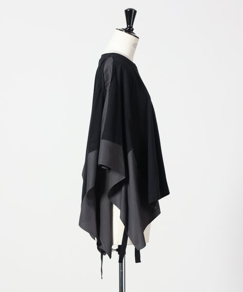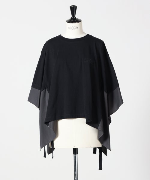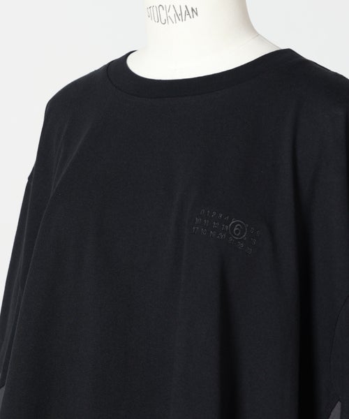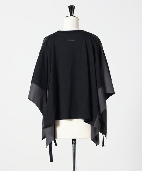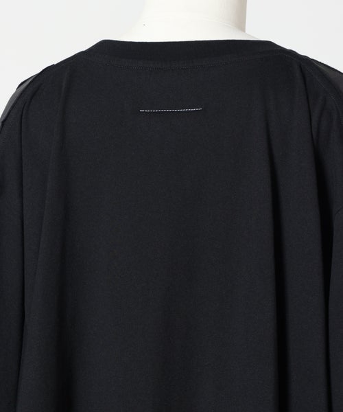 【デザイン】MM6 Maison Margiela(エムエムシックス メゾン マルジェラ)のTシャツ。ブランドらしい再構築の発想が光る一着で、ベーシックなTシャツの型を切り取り、その周囲を異素材で仕上げたポンチョ風デザインが特徴です。オーバーサイズシルエットにより、身体のラインを拾わずリラックスした着心地を実現しながら、動きに合わせて生まれるドレープがモードな印象を演出。シンプルながらも一枚でスタイリングの主役になる存在感があり、細身のパンツやスカートと合わせることでバランスの取れたコーディネートが完成します。着丈やボリューム感があるため、小柄な方はボトムをコンパクトにまとめるのがおすすめです。