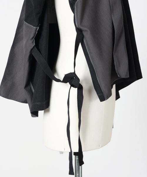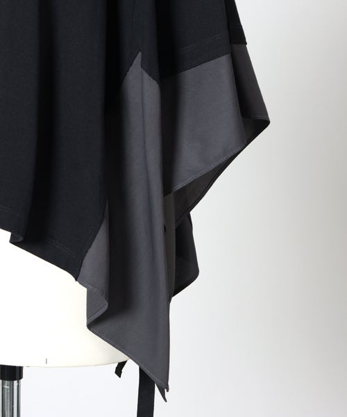 【素材】 本体にはコットン100%を使用し、さらりとした肌触りでデイリーに着やすい質感です。切り替え部分にはレーヨンとコットンの混紡素材を採用しており、しなやかで落ち感のある風合いが特徴。異素材の組み合わせにより、見た目にも奥行きが生まれ、軽やかで動きのある印象に仕上がっています。肌に触れた際は柔らかくストレスのない着心地で、見た目以上に軽さを感じられるのも魅力です。