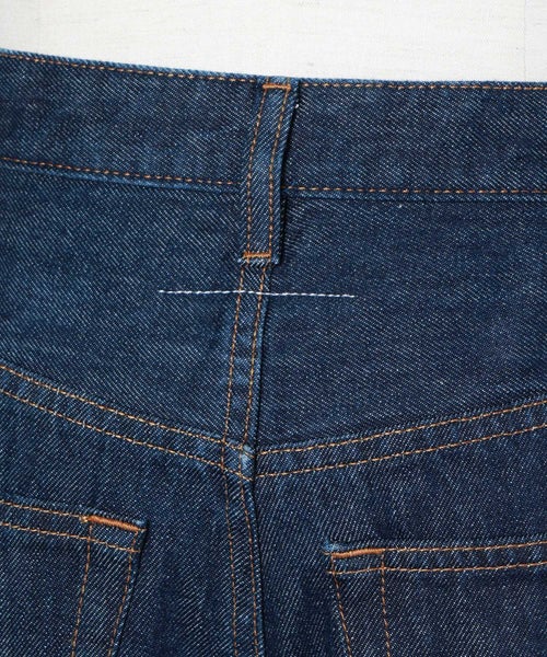 【素材】 コットン100%のデニム生地を使用し、しっかりとしたハリと程よい厚みが特徴です。手に取るとドライな質感で、着用するほどに身体に馴染み、経年変化も楽しめます。見た目はヴィンテージライクな風合いがあり、カジュアルながらも洗練された印象に。伸縮性はないため、ジャストサイズでの着用がおすすめですが、その分シルエットの美しさをしっかりとキープしてくれます。