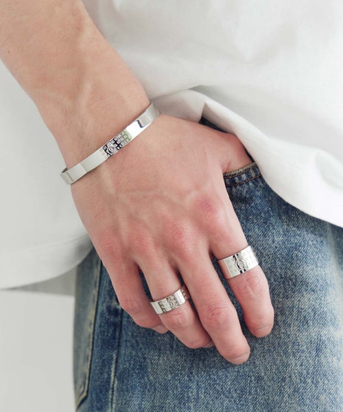 【デザイン】 MM6 Maison Margiela(エムエムシックス メゾン マルジェラ)のバングル。シルバー仕上げの真鍮を使用しています。フロントにはMM6のNumeric シグネチャーが刻印されています。