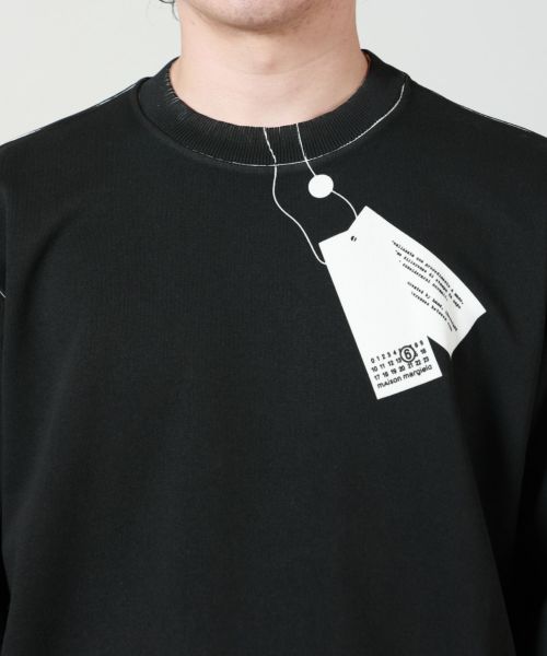 【デザイン】MM6 Maison Margiela(エムエムシックス メゾン マルジェラ)のスウェット。首元にタグがピンで留められているかのような、遊び心あるスクリーンプリントが目を引くスウェットシャツです。裁ちっぱなしのトリムやオーバーロックステッチが、プロセスに着目した美学を表現し、クラシックなスウェットにラフでエッジの効いた表情を添えています。バックには、さり気なくMM6を象徴する1本の白いステッチがあしらわれています。