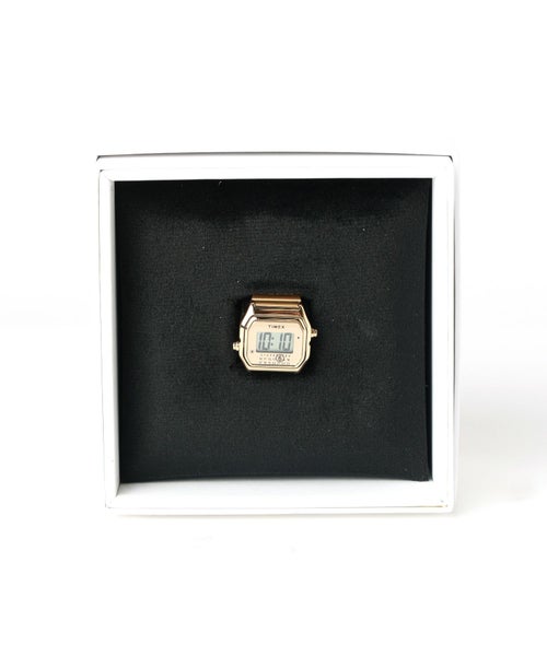【デザイン】MM6 Maison Margiela(エムエムシックス メゾン マルジェラ)のリング。タイメックス(TIMEX)とのコラボレーションから生まれた“T80 リングウォッチ”は、時計とジュエリーを重ね合わせた新感覚のアクセサリーです。エクスパンションバンドを採用し、指に心地よくフィットしながらデジタルウォッチ特有の存在感を楽しめるのが特徴。小さなフェイスに宿る液晶表示はミニマルでありながら、MM6らしい知性と遊び心を感じさせます。手元でさりげなく時間を確認できるだけでなく、コーディネートのアクセントとして視線を集めるデザイン。シンプルなリングとの重ね付けや、モードな装いのスパイスにもおすすめです。