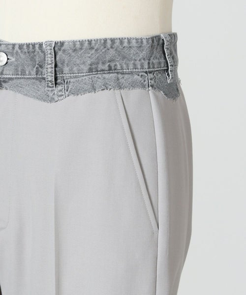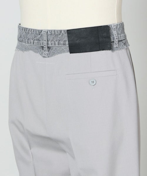 【デザイン】 MM6 Maison Margiela(エムエムシックス メゾン マルジェラ)のパンツ。端正なスラックスシルエットをベースに、異素材が組み合わさったデザインで、ベルトループ付きのジーンズスタイルのウエスト部分、前面と背面に入ったプレスされた折り目が特徴です。そのほかブランドを象徴するホワイトスティッチとロゴパッチが配されており、MM6ならではの再解釈によるデザインアプローチを感じさせるブランドらしい視点の宿るアイテムとなっております。