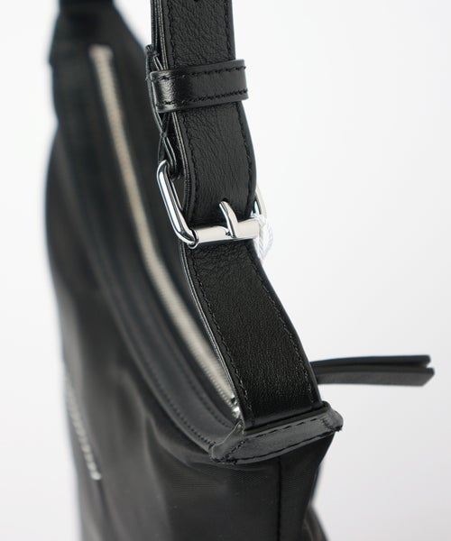 【素材】本体には軽量で扱いやすいナイロン100%素材を使用。さらりとしたなめらかな手触りと、程よい光沢感があり、都会的で洗練された印象を与えます。柔軟性のある生地感で身体に自然にフィットし、持ち運び時のストレスを軽減。コントラスト部分には牛革を使用することで、全体を引き締めつつ高級感をプラスしています.