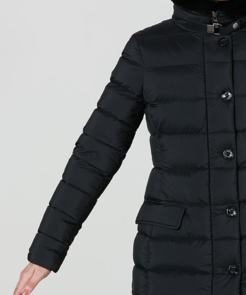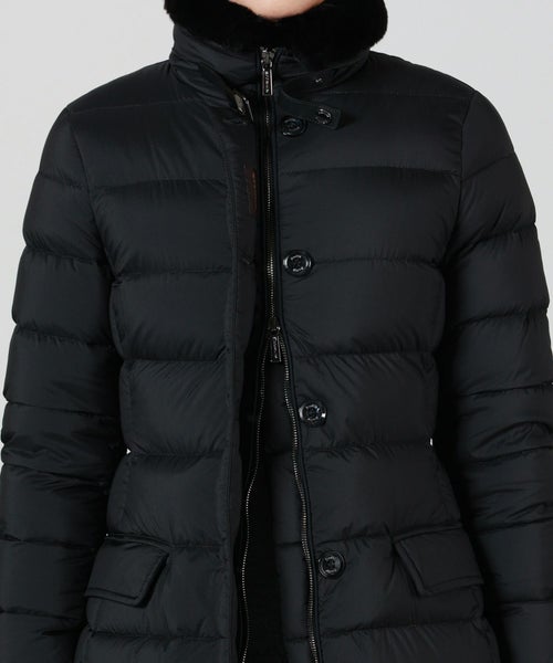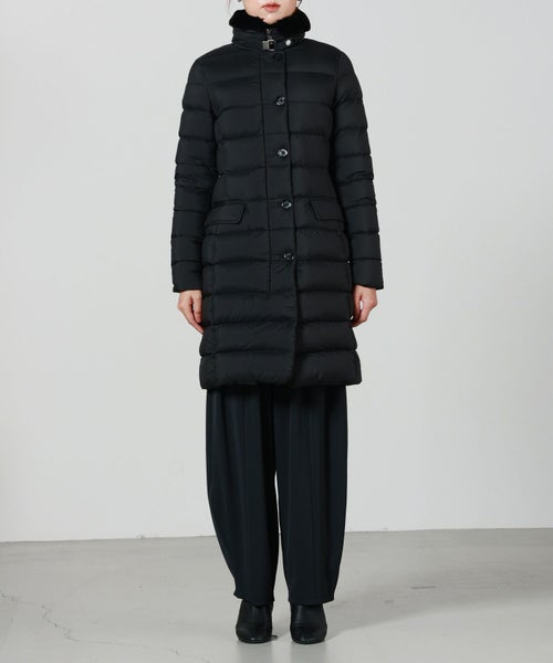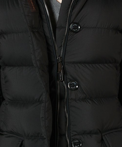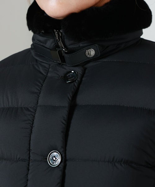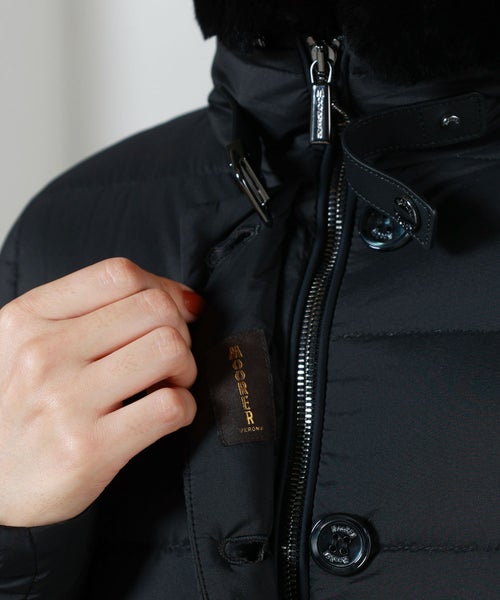 【デザイン】Moorer(ムーレー)のダウンコート。 洗練されたシルエットと贅沢な素材使いが際立つ一着。上品な光沢を持つナイロン素材に、首元にはレッキスラビットの毛皮、ジップ部分などのアクセントに牛革を施した異素材ミックスが高級感を演出しています。フロントはダブルジップ仕様で、防寒性とスタイリッシュさを両立。首元のレッキスラビットのファーは、取り外しが可能で、しかも逆さまに付け替えることで表側にも内側にもアレンジできる2WAY仕様。スタイリングや気温に合わせて表情を変えられる、機能的かつ上質なデザインが魅力です。ゆとりのあるフィット感ながら、立体的なパターン設計で着膨れ感を抑え、すっきりとした美しいラインを実現。カジュアルにもエレガントにも対応可能なデザインで、日常使いはもちろん、冬の旅行や特別な外出シーンにも活躍します。