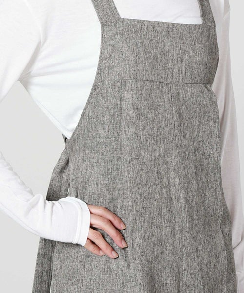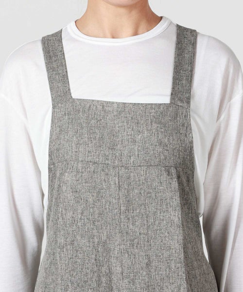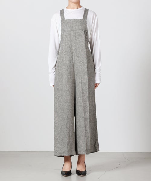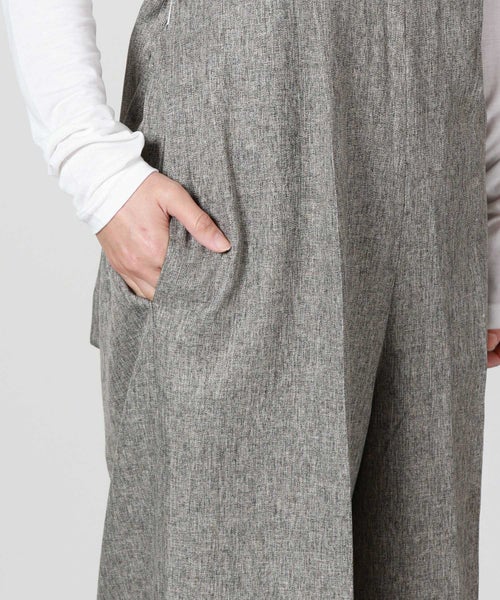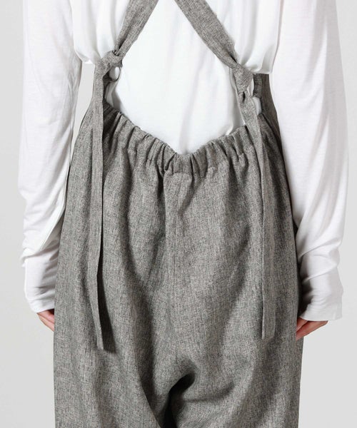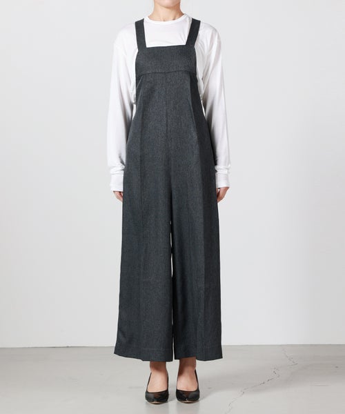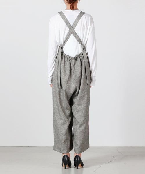 【デザイン】Munich(ミューニック)のオーバーオール。 ツイードツイルの上品な表情を活かし、カジュアルになりがちなオーバーオールを大人がきれいめに着られるコンビネゾンとして仕上げた一着です。程よい肉感とハリのある素材が、タックからつながるセンタープレスを美しくキープし、縦のラインを強調。胸下からほんのり広がるワイドシルエットは太過ぎず、体のラインを拾いにくいバランスで、スタイルアップも期待できます。フロントは端正でマニッシュな印象ながら、バックスタイルは大胆に開き、ウエストゴム仕様で程よく力の抜けた雰囲気に。共地で作られた肩紐は後ろ脇の丸カンにラフに結び、長めに垂らすことでさりげないアクセントになります。カマ底を低めに設定しているため、タイトなインナーからゆったりしたトップスまでレイヤードしやすく、シーズンレスで着回せるのも魅力です。