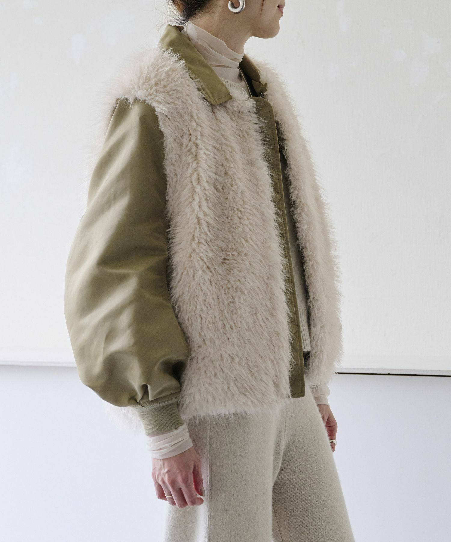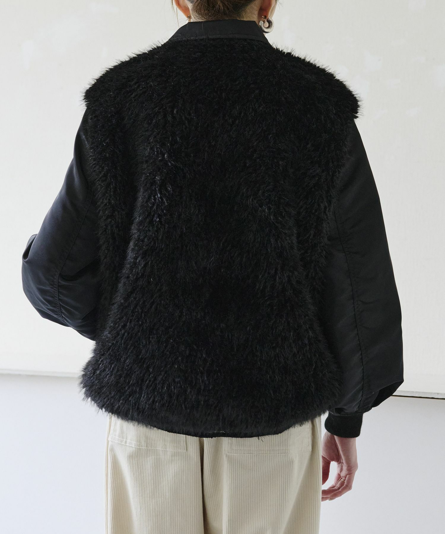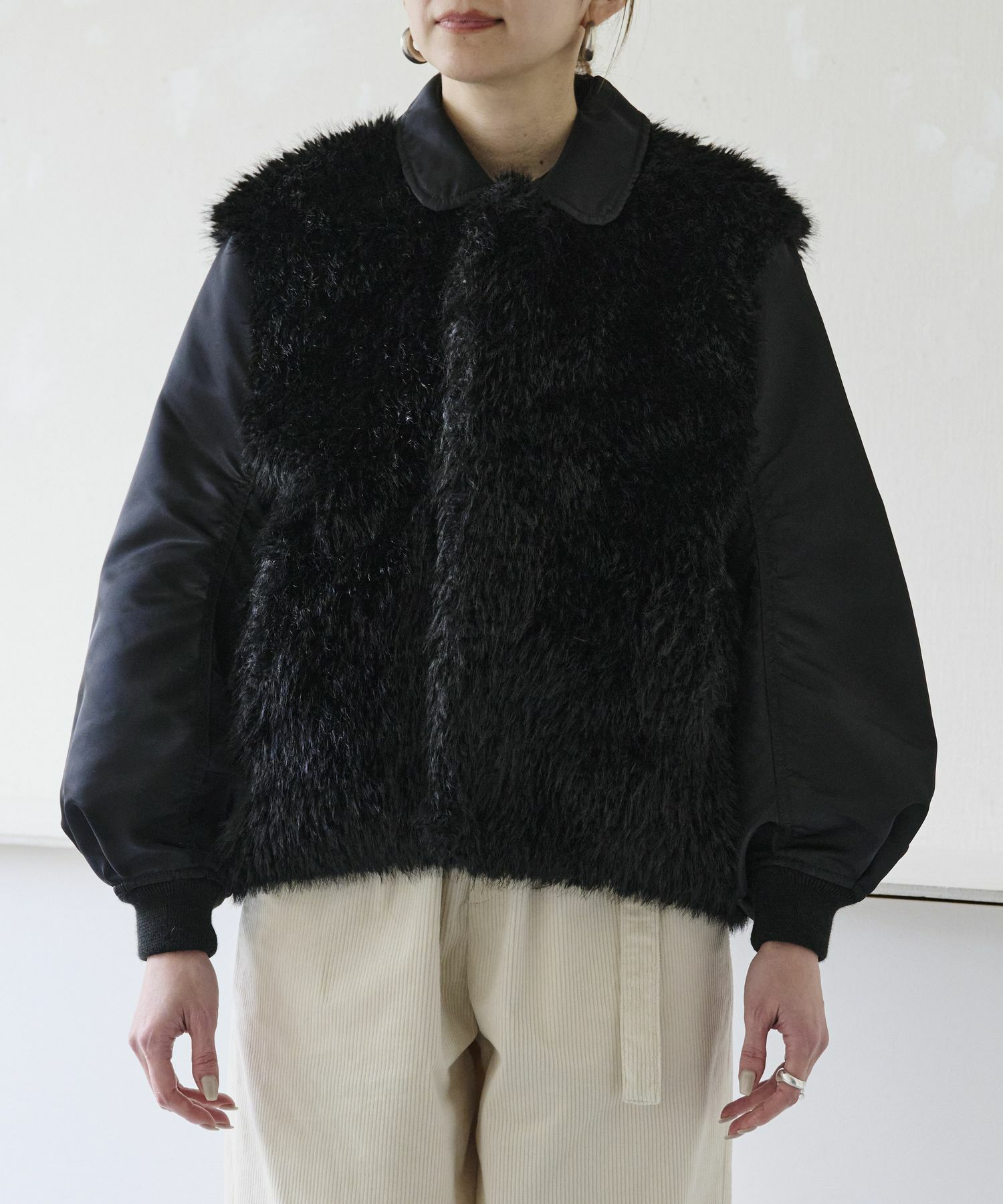 【デザイン】near.nippon(ニアーニッポン)のブルゾン。シーズンを通してベストセラー合うテムのMA-1ブルゾンを変化させ、高品質なフェイクファーとドッキングしよりデザイン性の高いアイテムにしています。オーソドックスなMA-1よりラグジュアリーでファーアイテムとしてはよりデイリーに楽しめるハイブリッドな1枚です。