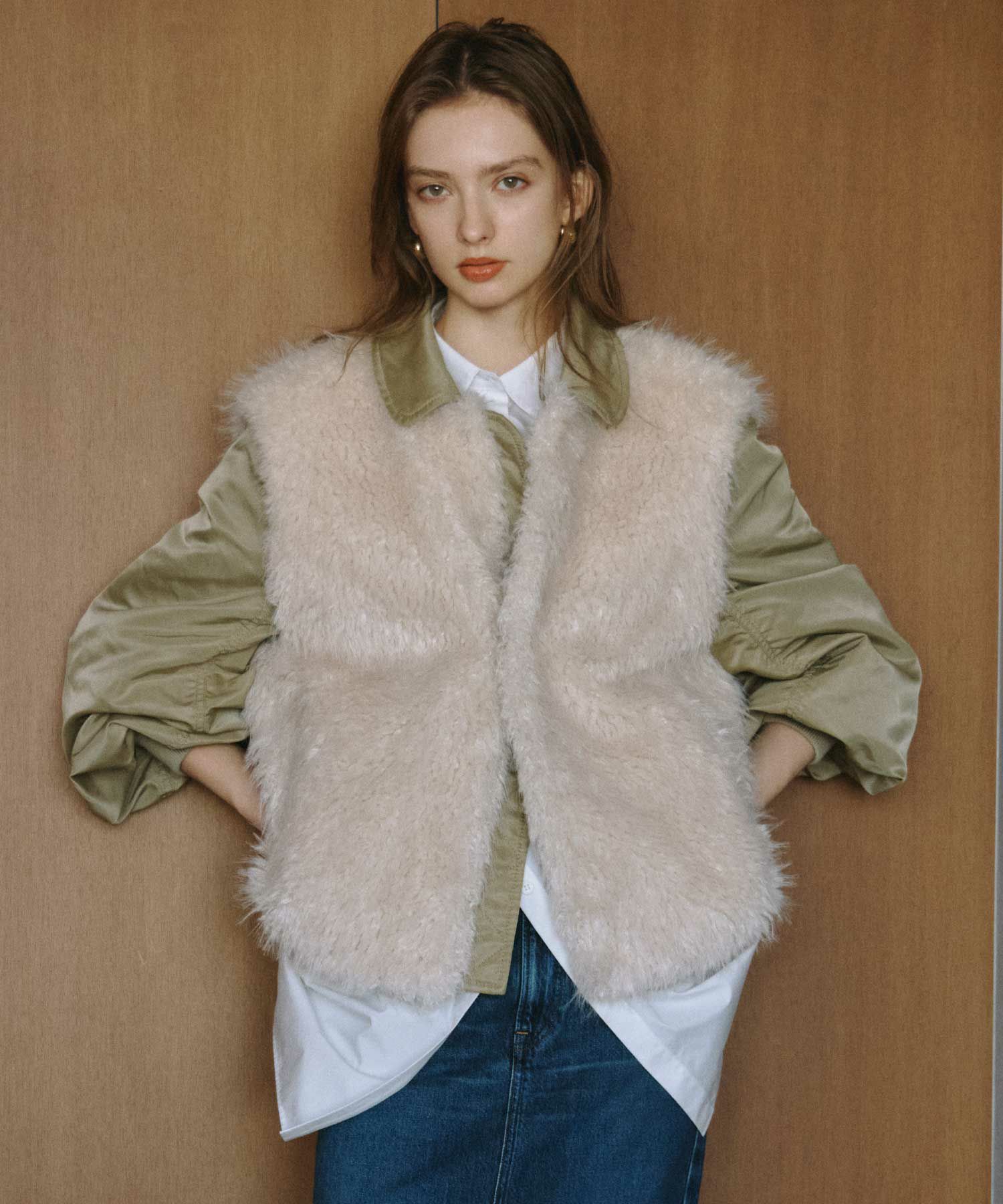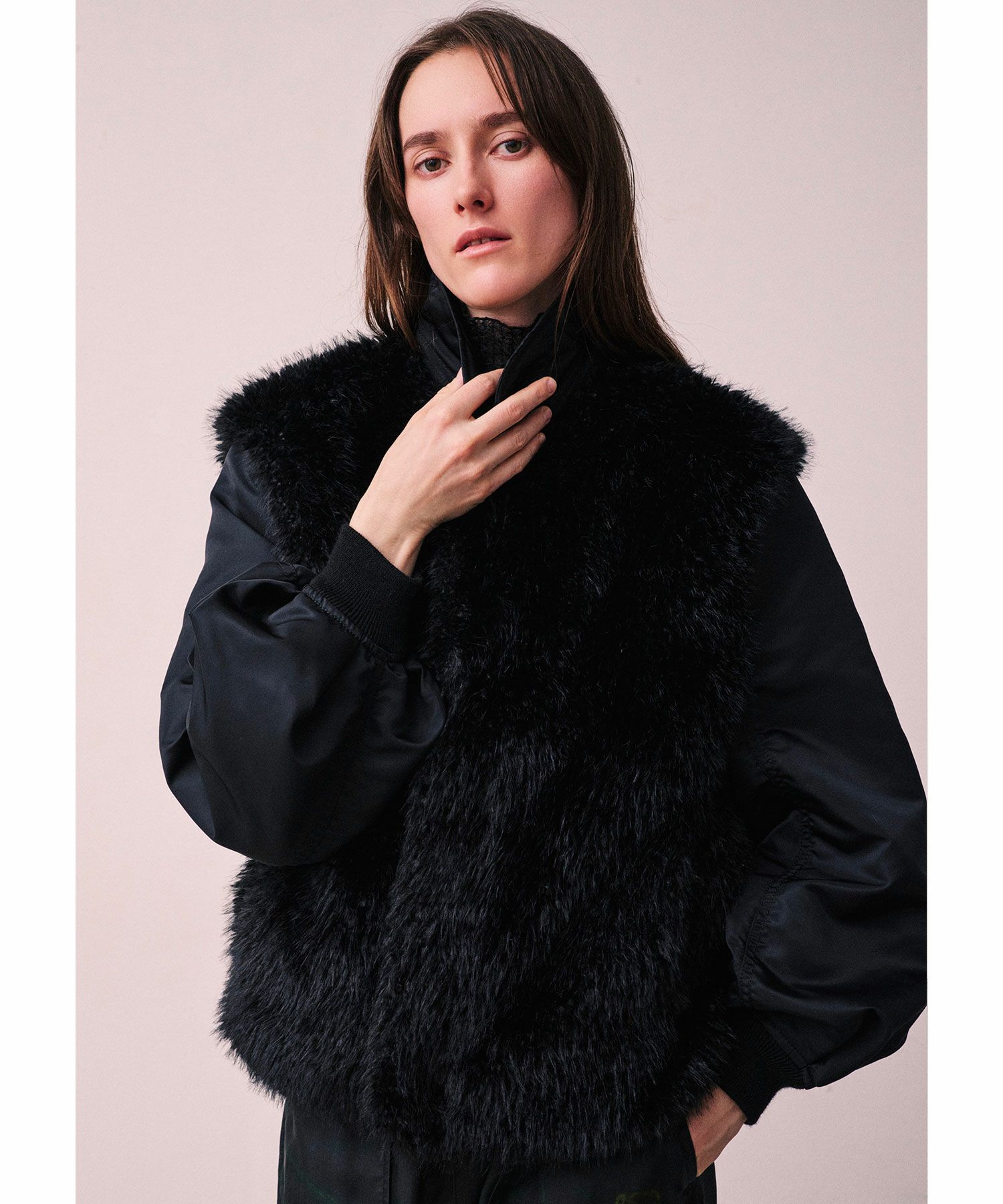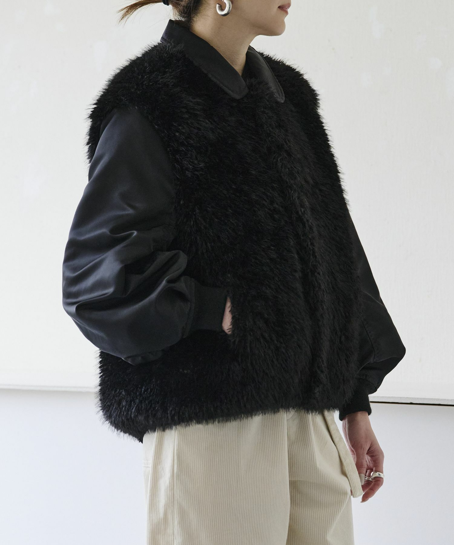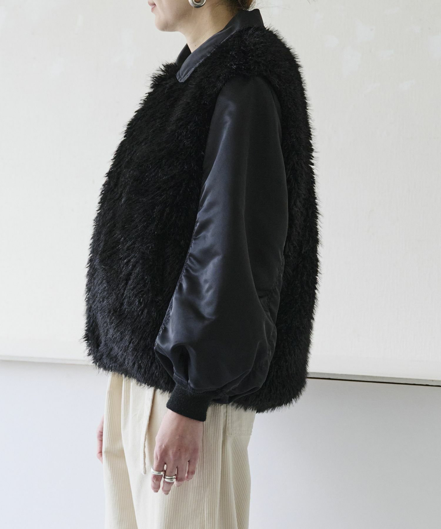 【デザイン】near.nippon(ニアーニッポン)のブルゾン。シーズンを通してベストセラー合うテムのMA-1ブルゾンを変化させ、高品質なフェイクファーとドッキングしよりデザイン性の高いアイテムにしています。オーソドックスなMA-1よりラグジュアリーでファーアイテムとしてはよりデイリーに楽しめるハイブリッドな1枚です。