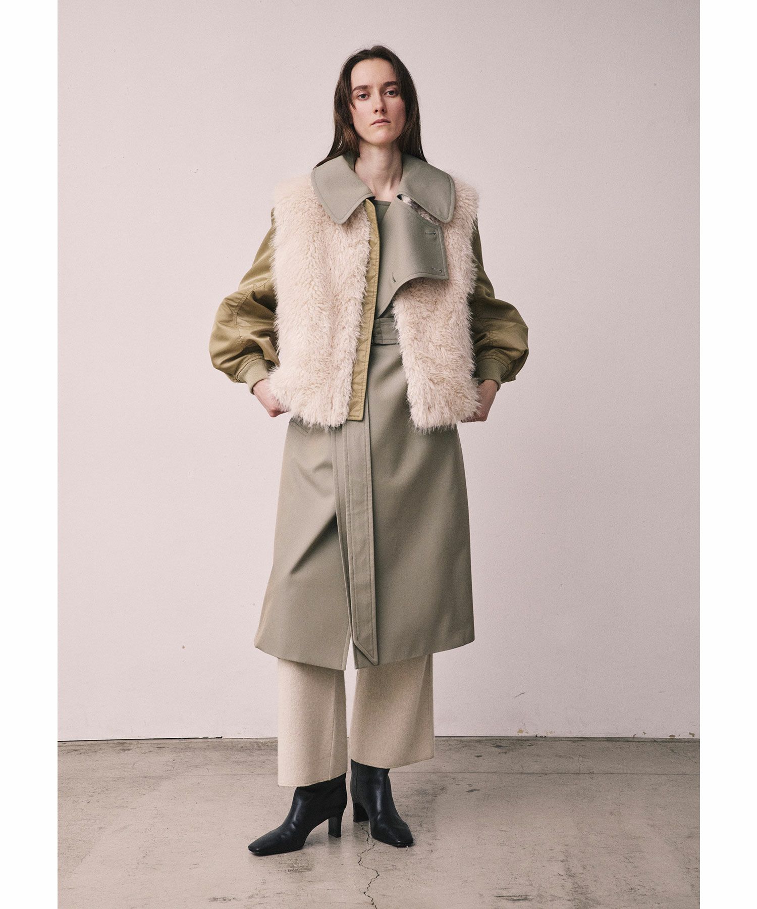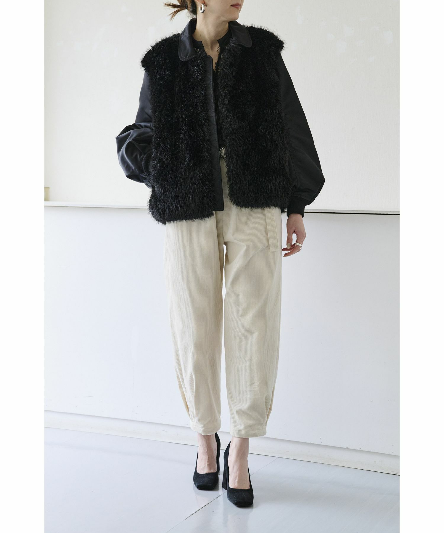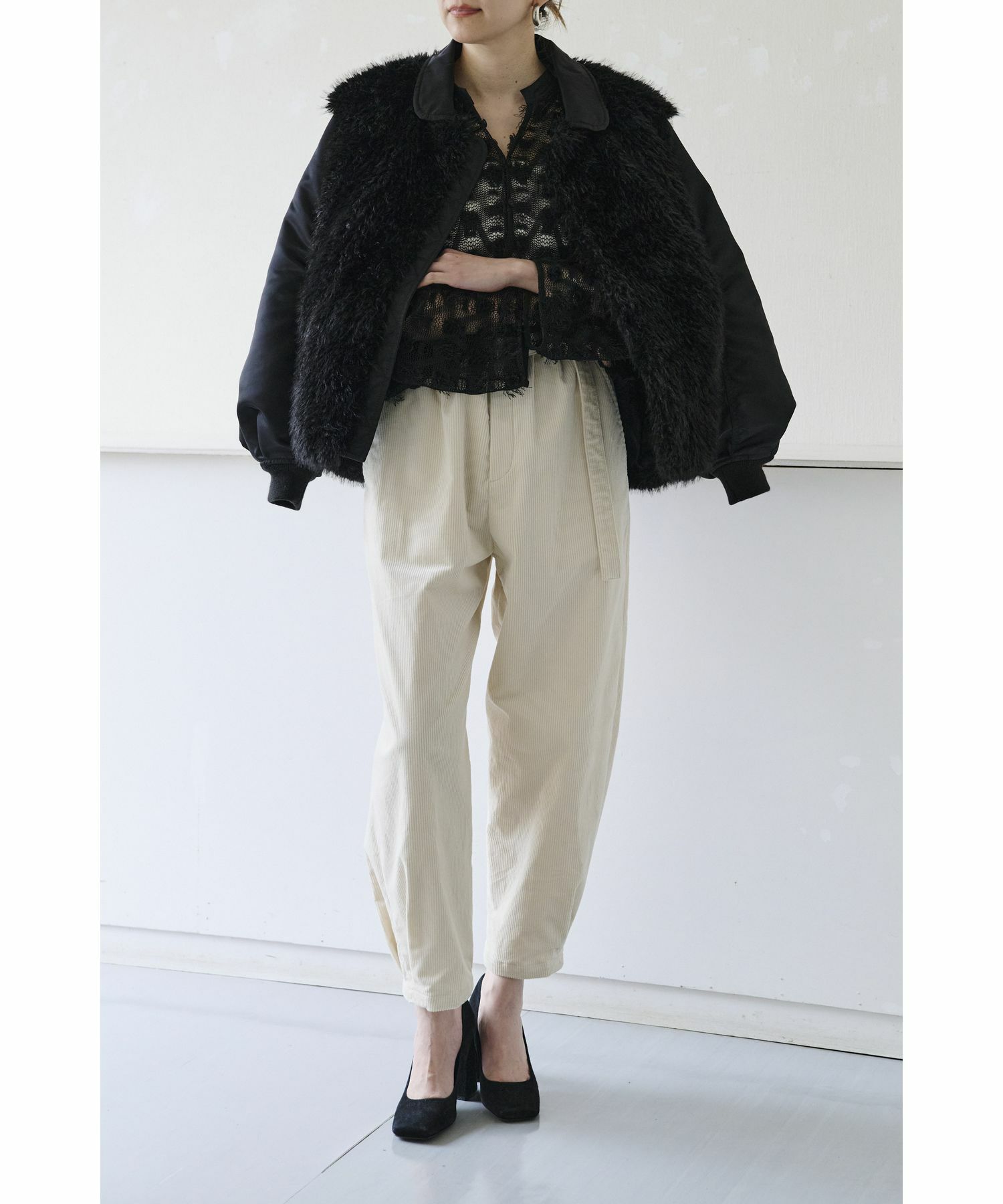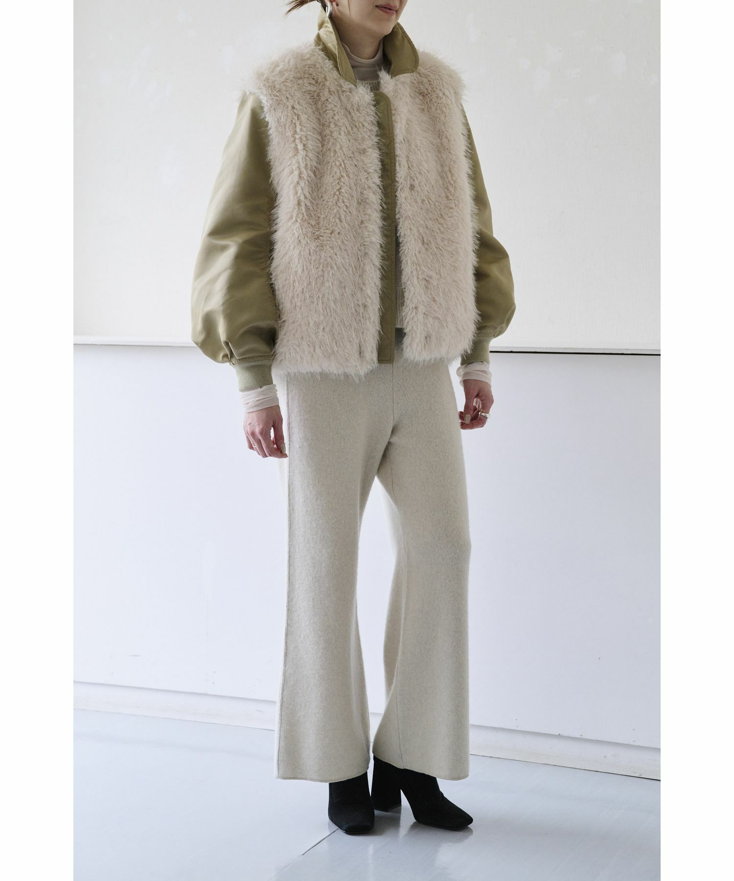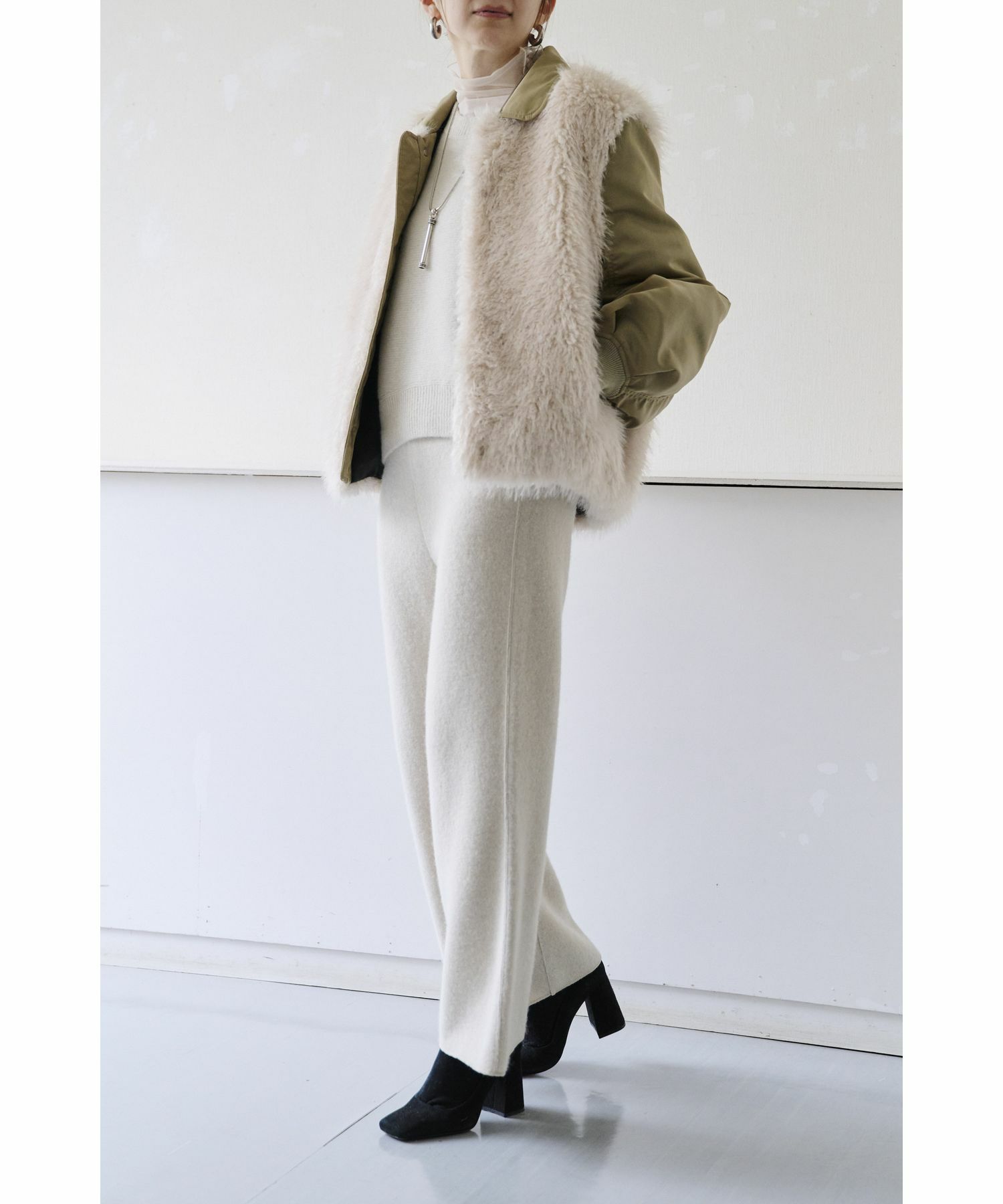 おすすめポイント:フェイクファーで見た目とってもあたたかく見えますが中綿は入っておらず息の長いブルゾンです。お車移動の方は秋から真冬まで、このアウター1枚あれば過ごせそう。