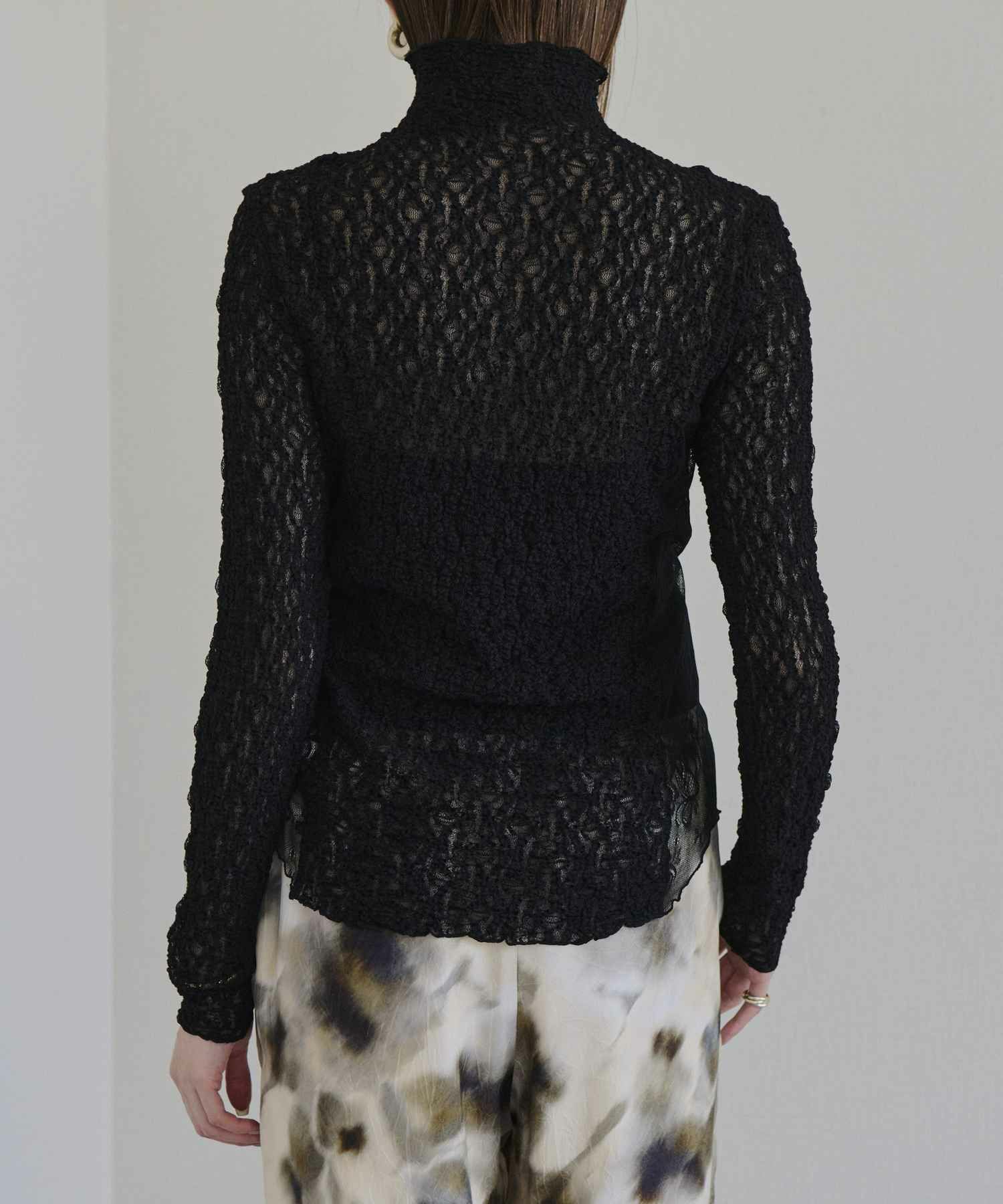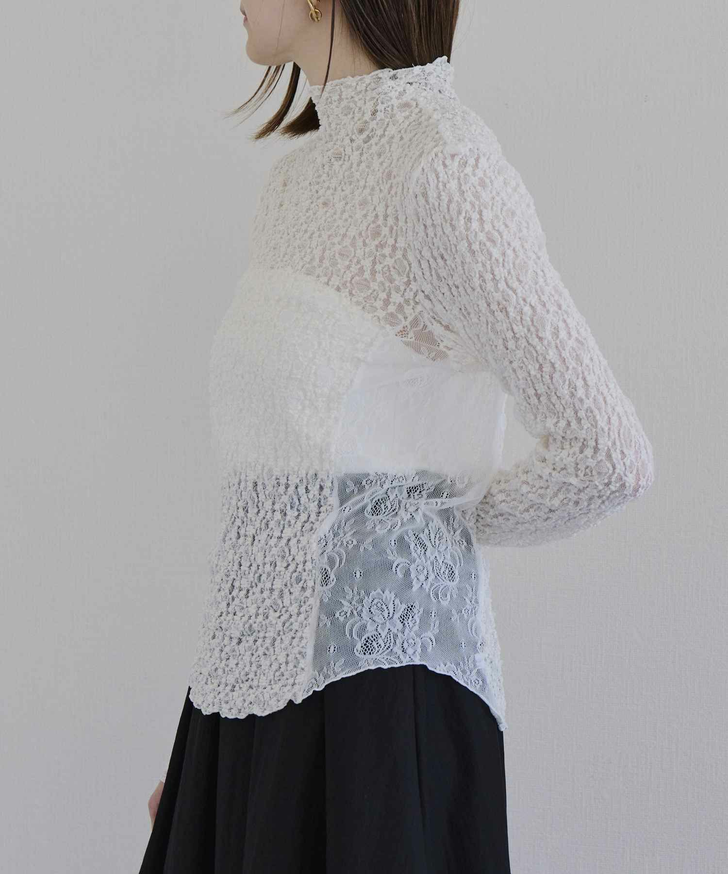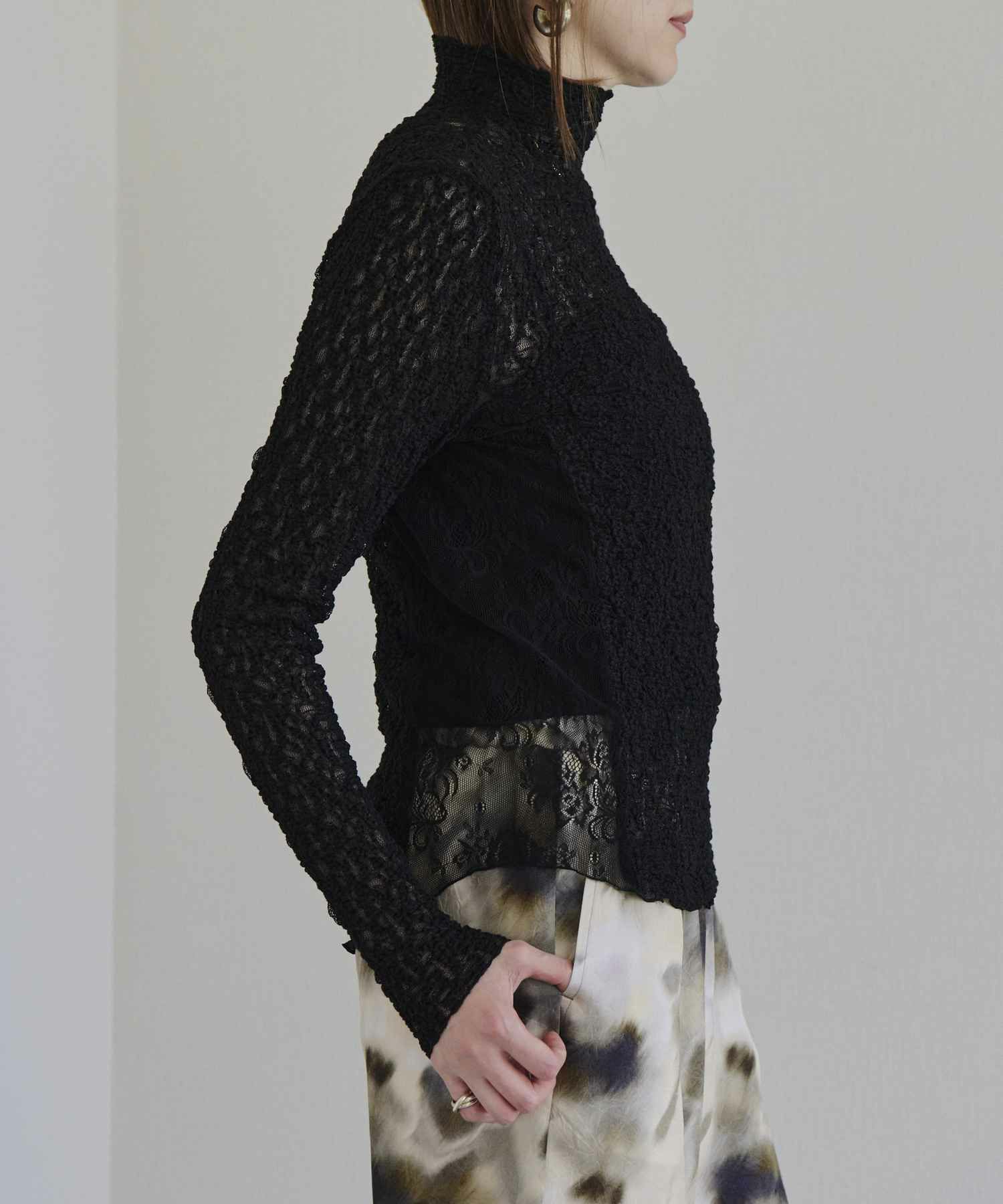 【デザイン】near.nippon(ニアーニッポン)の衿幅にこだわったボトルネックレーストップス。 首に沿って美しく立ち上がる衿幅にこだわったボトルネックトップス。異なる2種類のレース生地を切り替えたデザインが、さりげないラグジュアリー感を演出します。 主役アイテムとしてはもちろん、インナーとして衿元だけを見せるスタイリングもおすすめ。多彩なシーズンで活躍し、使い勝手の良い一枚です。 シックな雰囲気ながらも、ワーク調のボトムと合わせることでカジュアルに程よい緊張感が生まれ、上品なクラス感のあるスタイリングに仕上がります。 凹凸感のある生地が体のラインを優しくカバーし、フィット感がありながらも窮屈さを感じさせない快適な着心地も魅力です。
