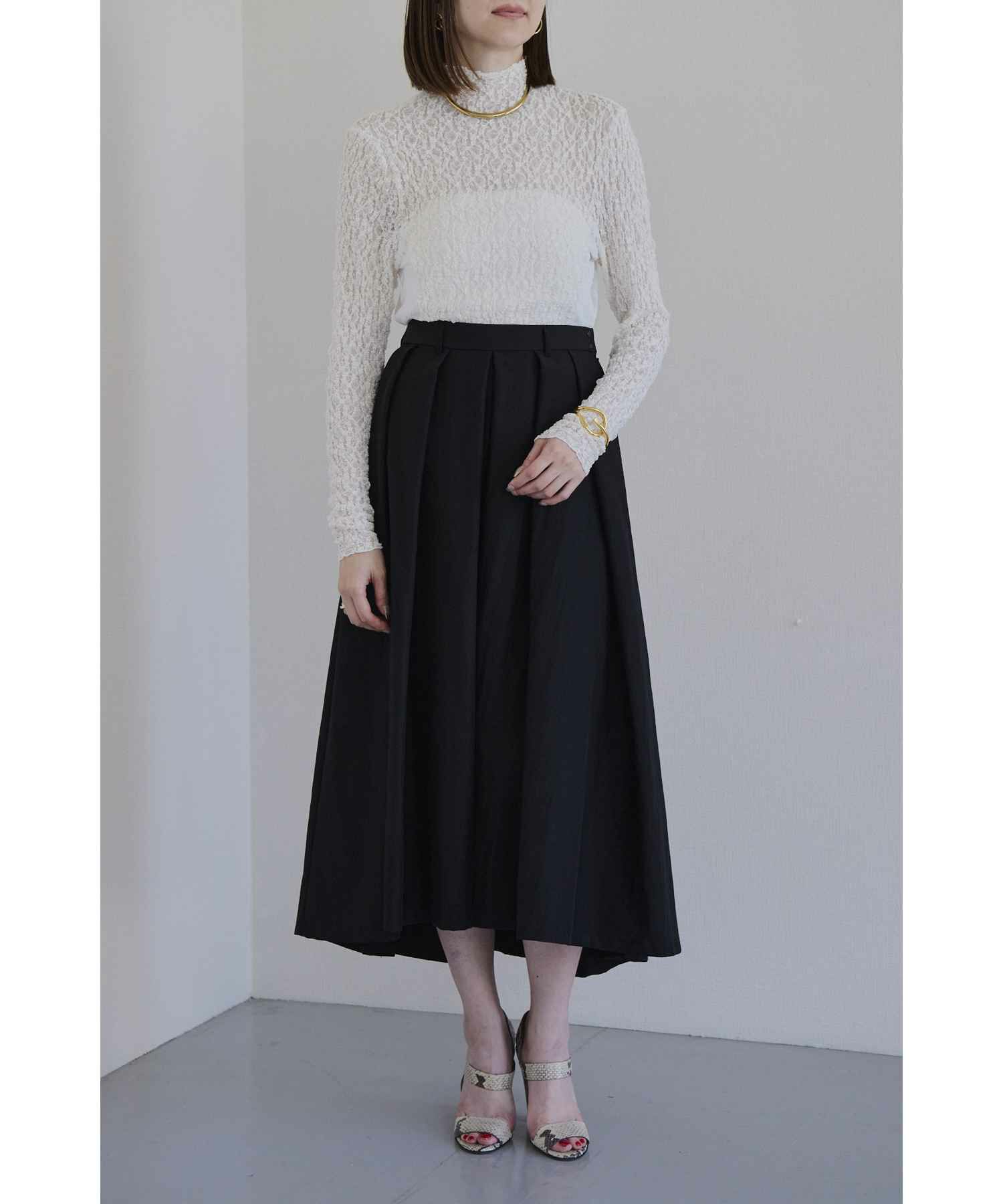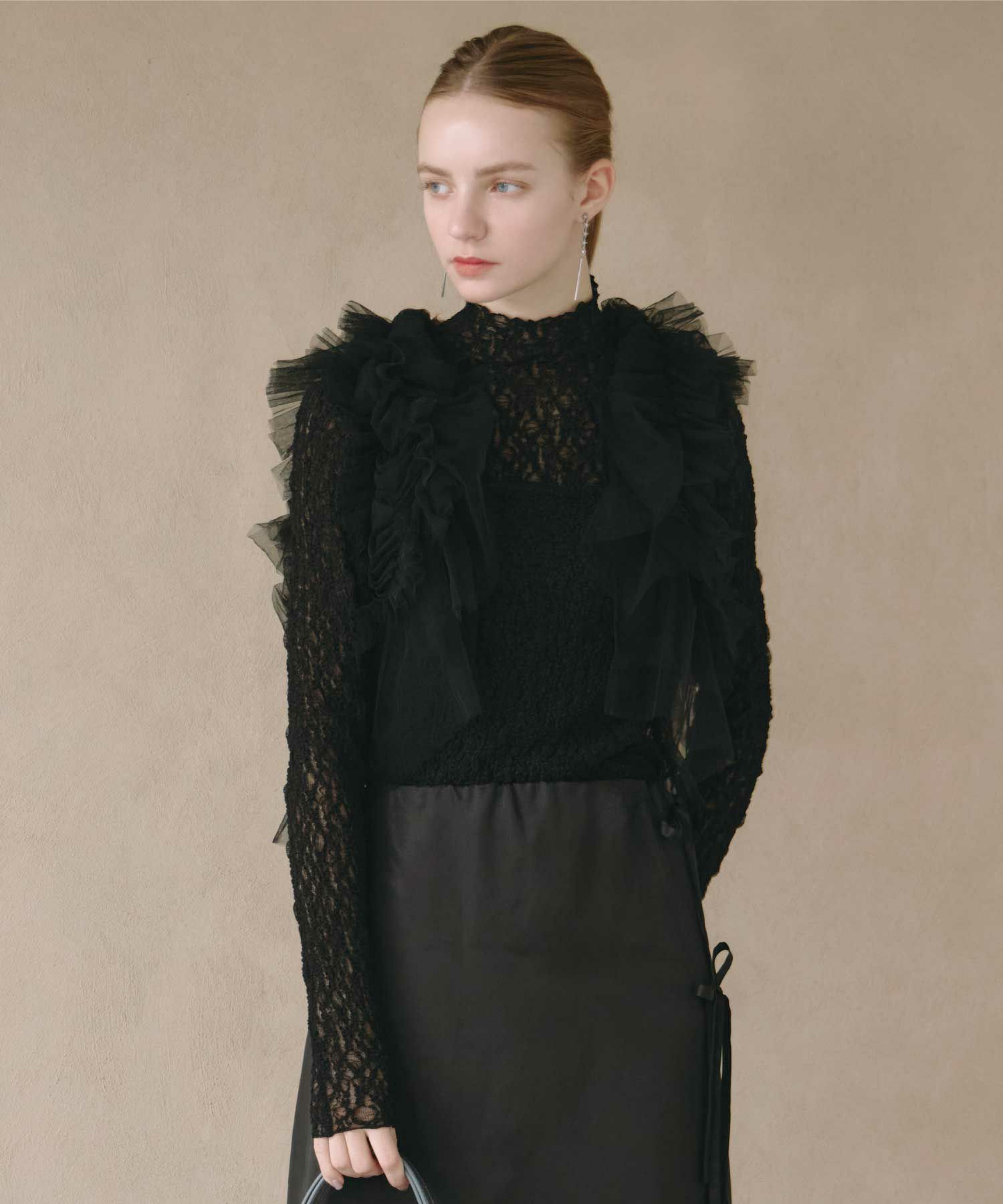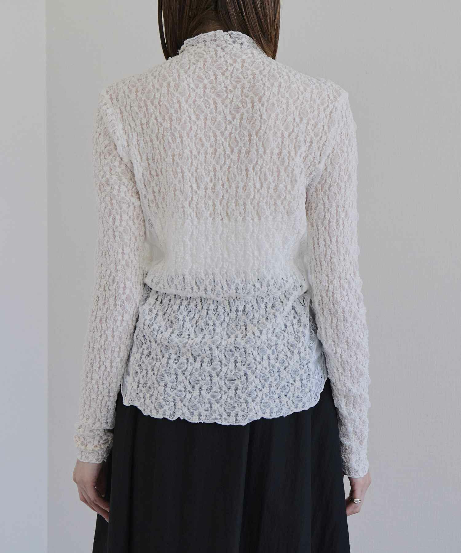【デザイン】near.nippon(ニアーニッポン)の衿幅にこだわったボトルネックレーストップス。 首に沿って美しく立ち上がる衿幅にこだわったボトルネックトップス。異なる2種類のレース生地を切り替えたデザインが、さりげないラグジュアリー感を演出します。 主役アイテムとしてはもちろん、インナーとして衿元だけを見せるスタイリングもおすすめ。多彩なシーズンで活躍し、使い勝手の良い一枚です。 シックな雰囲気ながらも、ワーク調のボトムと合わせることでカジュアルに程よい緊張感が生まれ、上品なクラス感のあるスタイリングに仕上がります。 凹凸感のある生地が体のラインを優しくカバーし、フィット感がありながらも窮屈さを感じさせない快適な着心地も魅力です。