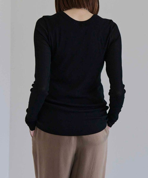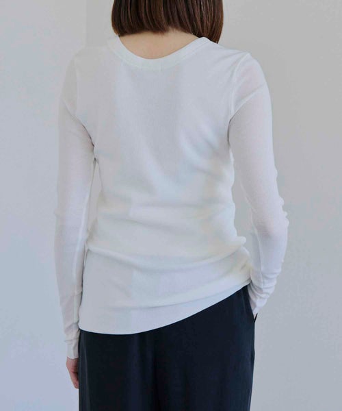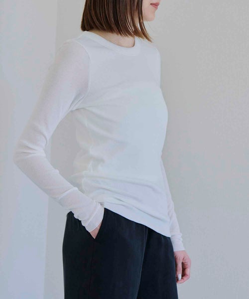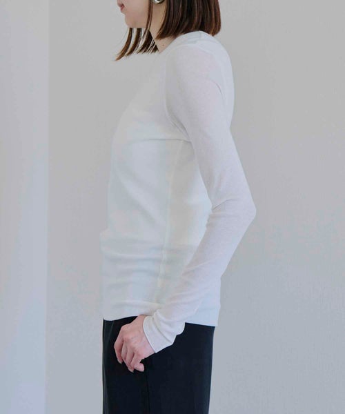 【デザイン】適度なフィット感で身体のラインを美しく見せる、タイトシルエットのロングスリーブトップス。 薄手のコットンリブを使用し、身頃を二重に仕立てることで透け防止と程よい体型カバーを両立。袖は一重仕様でごわつかず、すっきりと着用できます。 ネックラインは太めのバインダー始末にこだわり、国内で丁寧に縫製。伸びや型崩れが少なく、上品に着られます。ラウンドネックは浅すぎず深すぎず、トップスとしても見せインナーとしても使いやすい絶妙なラインです。 オールシーズン活躍する、メイントップスとしてもインナーとしても頼れる、着心地の良い一枚です。