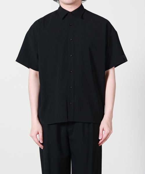 【デザイン】N.Hoolywood(エヌハリウッド)のシャツ。ドレスライクなディテールを随所に取り入れた、ビッグシルエットのハーフスリーブシャツ。背面に施したインボックスプリーツが立体感のあるAラインシルエットを生み出し、動きのある柔らかなフォルムを演出します。ドロップショルダーとスクエアカットにより、リラックス感とモダンなバランスを両立。三つ巻き本縫い仕様やブランドロゴ入りのオリジナルボタンなど、細部まで丁寧に仕上げられています。CHARCOALカラーには配色ステッチを施し、さりげないコントラストで奥行きのある表情をプラスしています。