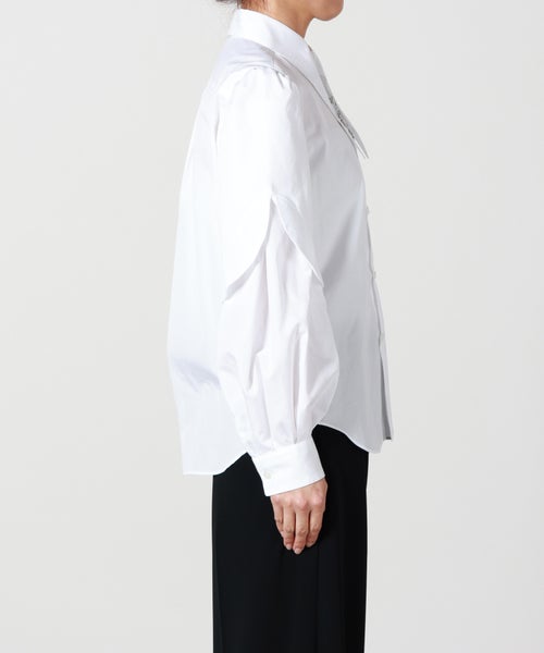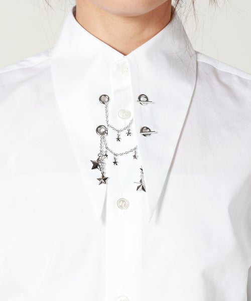 【デザイン】noir kei ninomiya(ノワールケイニノミヤ)のシャツ。クリーンなシャツにあしらったアイコニックなスターモチーフのチャームが特徴の一着です。取り外しが可能なチャームはアクセサリー感覚で身に着けることができ、ネックレスいらずでコーディネートが映えるのも魅力です。ブランドらしい遊び心とモード感を兼ね備えたアイテムに仕上がっています。