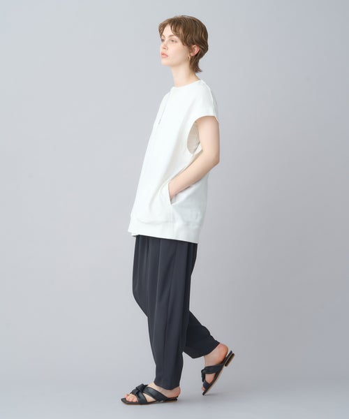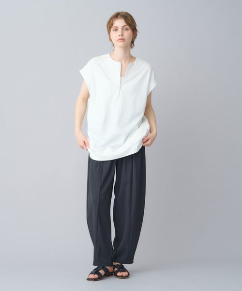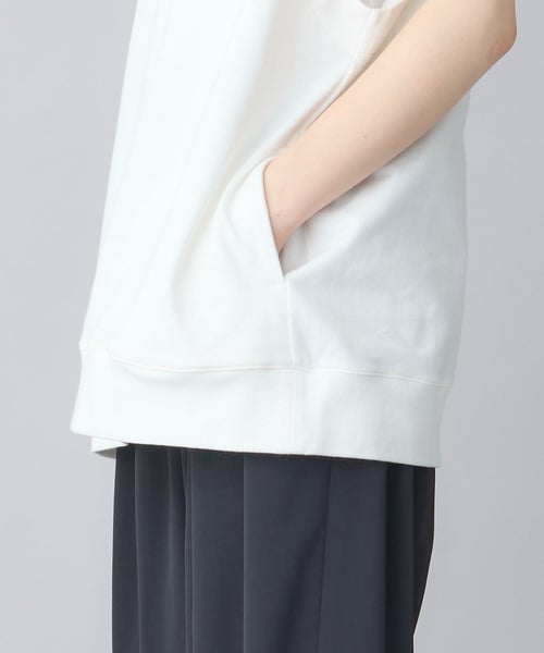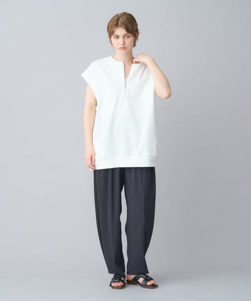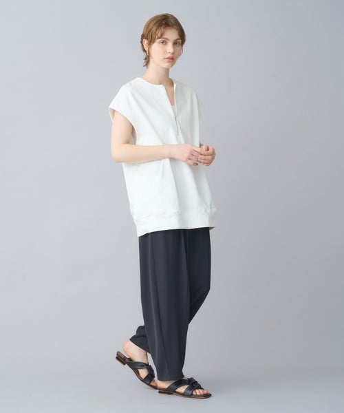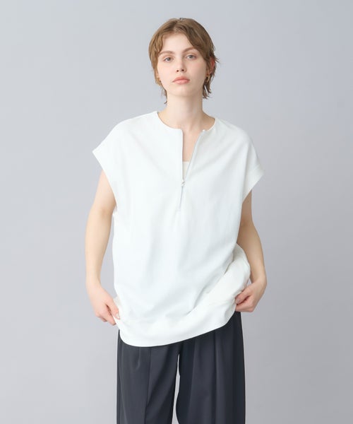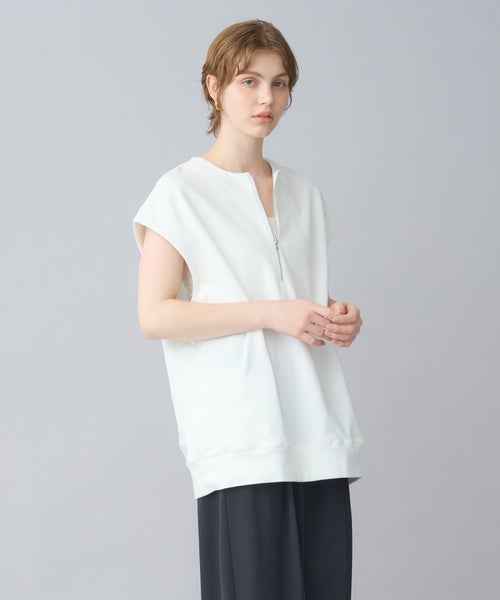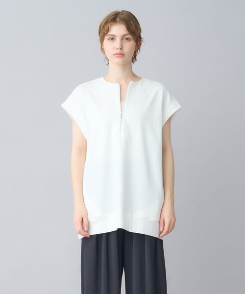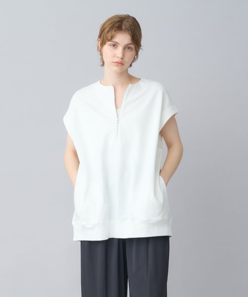 【デザイン】 トレンド感のあるハーフZIPプルオーバーで、フレンチスリーブが特徴。気になる二の腕周りをさりげなくカバーしつつ、スッキリとした印象を与えてくれます。ZIPを開けることで深いVネックが見え、クリーンでシャープなシルエットに。1枚でシンプルに着るのはもちろん、カットソーやシャツとのレイヤードスタイルでも活躍する万能アイテムです。ヒップが隠れる長めの着丈で、体型を気にせずリラックスして着用できます。
