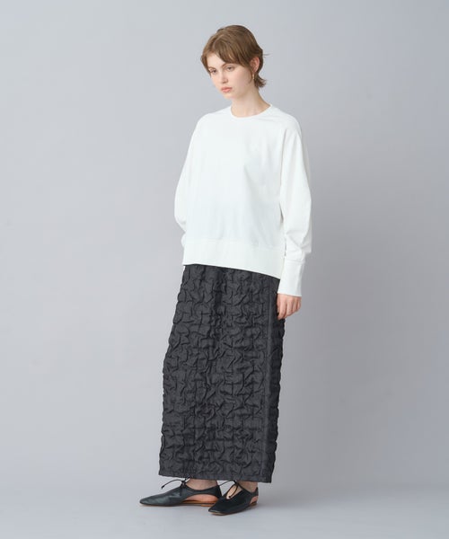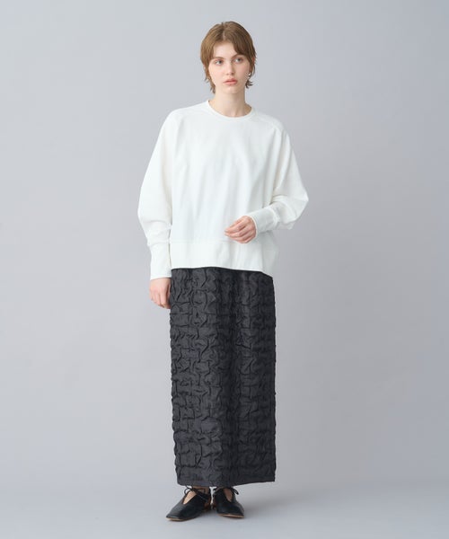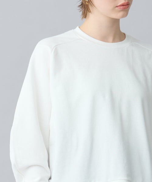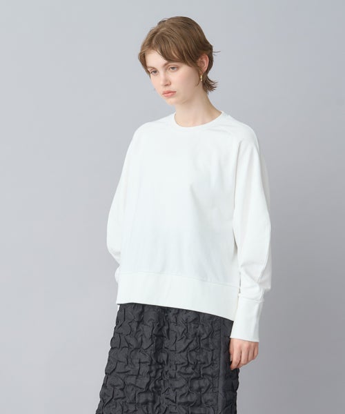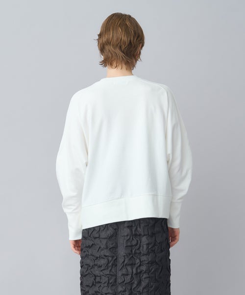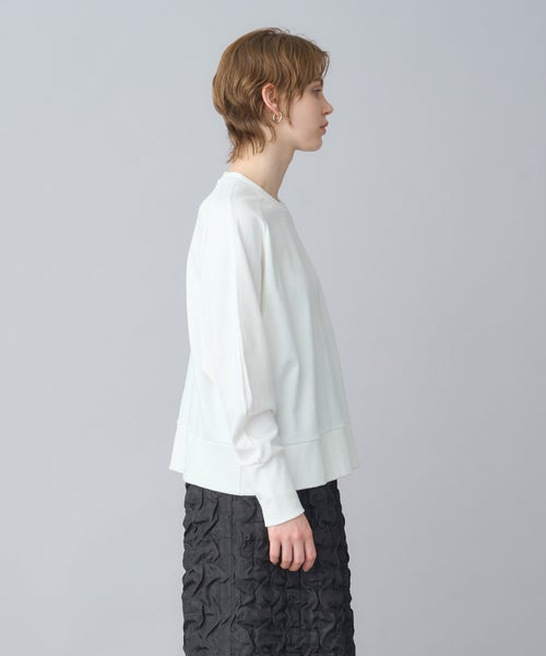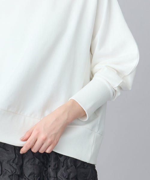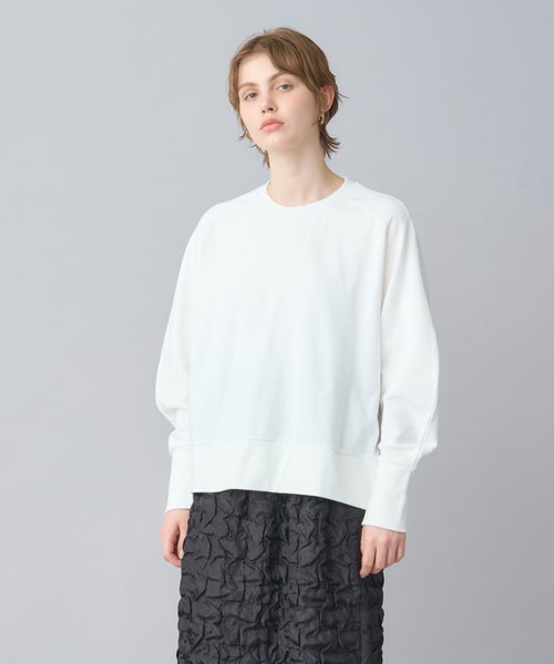 【デザイン】 リラックス感のあるシルエットが魅力のスウェットプルオーバー。ボリュームを持たせ、カーブを描くバナナスリーブがさりげないポイントとなり、シンプルながらも印象的なデザインに仕上げました。すっきりとした着丈で、パンツ・スカート問わずバランス良く着用できます。カジュアルになりすぎないようシルエットにこだわり、ほどよくモードな印象をプラスした一枚です。