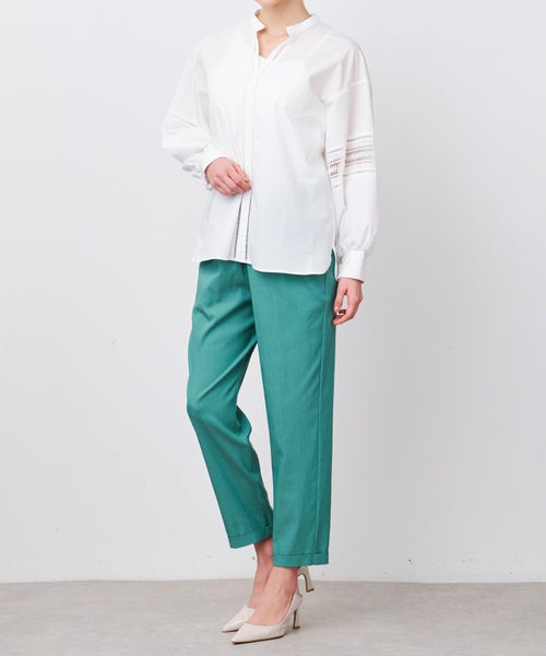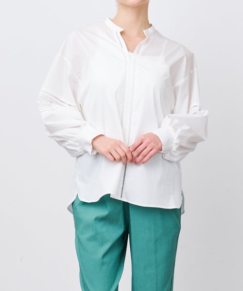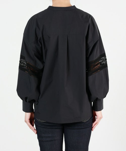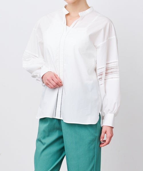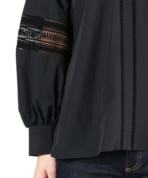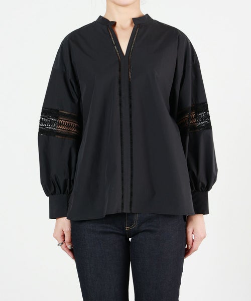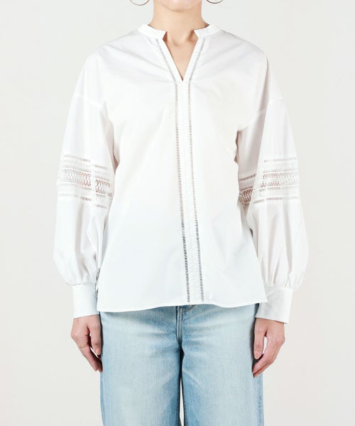 甘さを抑えたレース柄とボリュームのあるスリーブが特徴のブラウス。キーネックとハシゴレースがシャープな印象をプラスし、大人の女性らしいエレガントなスタイルを演出します。