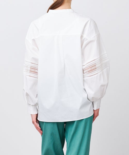 人気ブラウスの型を基に、袖と前身頃のレース柄を変更してアップデート。動きのあるモチーフを採用したレースが、リピートデザインでありながら新鮮な見え方を実現。スリーブアウトスタイルでさらに異なる印象を楽しめます。