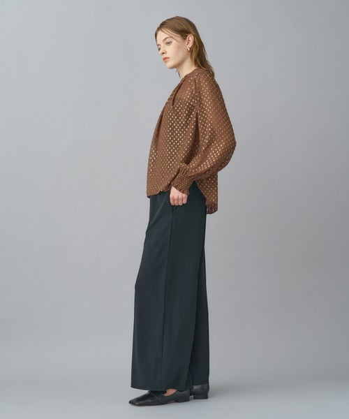 襟元は首元をすっきりと見せるちびハイネック仕様。袖口はシャーリング仕立てで、たくし上げることで抜け感のある表情も楽しめます。