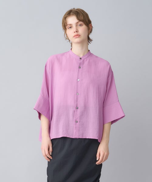 【素材】ナイロンとレーヨンを交織した素材で、ナイロンの軽さに加え、レーヨンの落ち感が絶妙なバランスを生み出します。触るとサラリとした質感で、着心地もとても快適です。ナチュラルなシボ感が特徴的で、シンプルでありながらも奥行きのある風合いを感じさせます。高級感がありつつも、程よく軽やかで、春夏から秋口まで幅広いシーズンで活躍すること間違いなしの素材です。