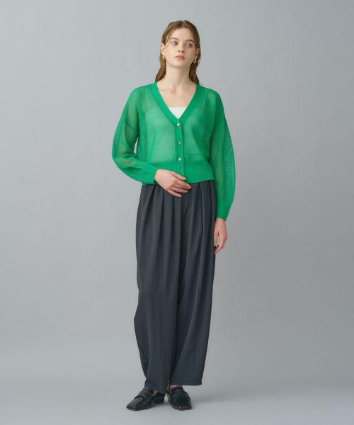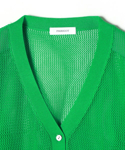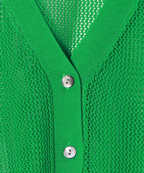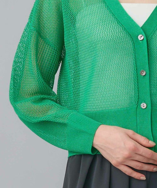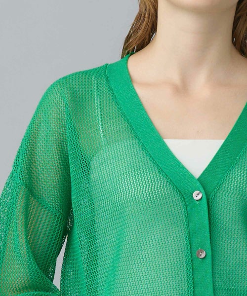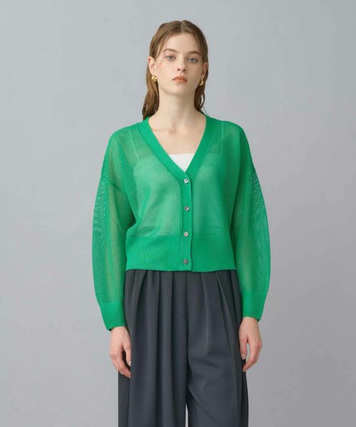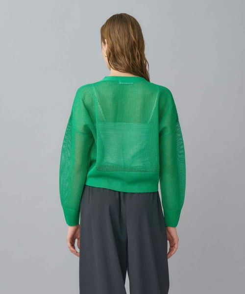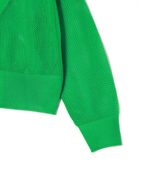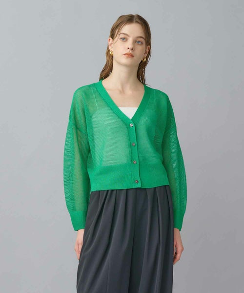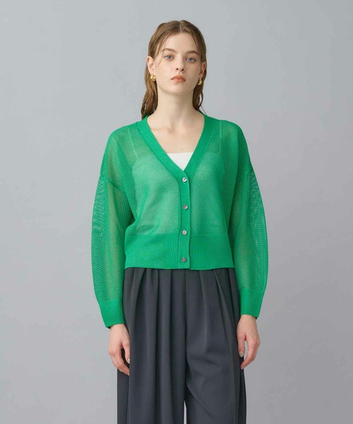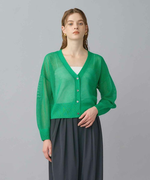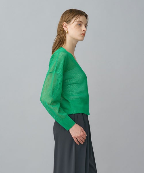 羽織るだけでバランスの良いコーディネートに。クロップド丈とメッシュ編みの透け感が、デニムやスカートとのスタイリングを洗練された印象に仕上げます。