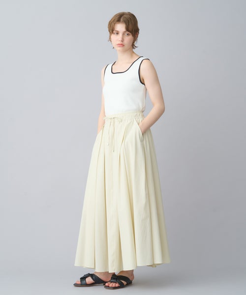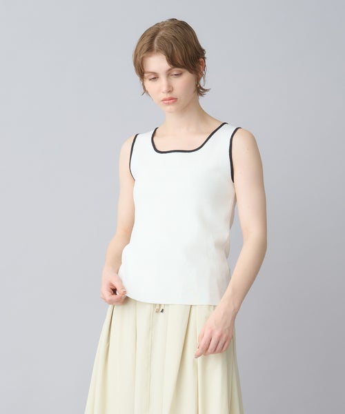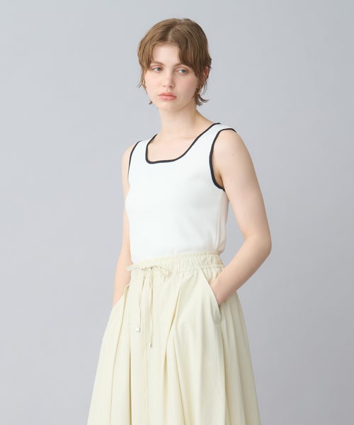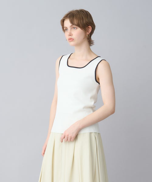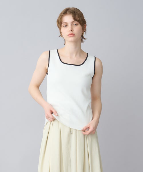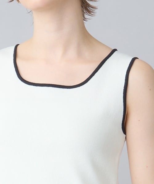 【デザイン】 デコルテを美しく見せるスクエアネックが特徴のバイカラーニットタンクトップ。程よいラウンド調のスクエアネックがこなれ感を演出し、配色がアクセントとなったリンガーニットタイプが新鮮です。ニット素材ながら透けにくく、ストレッチ性とシャリ感を持ち合わせた、着心地の良さも魅力。シャツやジャケットのインナーとしても使いやすく、さまざまなコーディネートにマッチします。シンプルながら存在感のあるデザインで、1枚でも重ね着でも活躍するアイテムです。