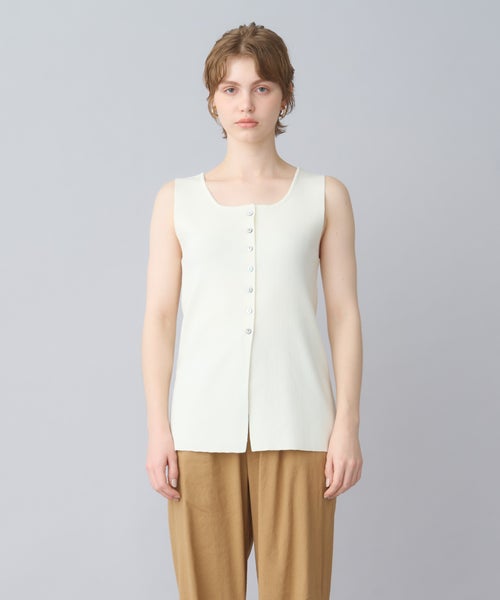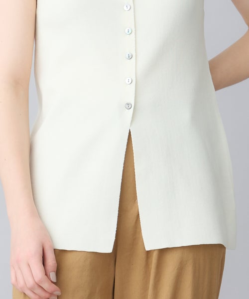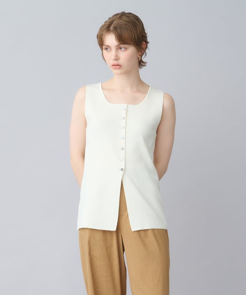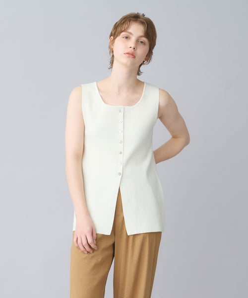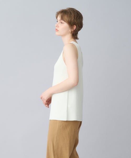 【デザイン】PARIGOT(パリゴ)のタンクトップ。レーヨンとナイロンをベースにした清涼感のある素材を使用した、前後2WAYで着用できるニットタンクトップ。ゆるやかなスクエアーネックが顔周りをすっきりと見せ、長めの着丈が安心感を与えてくれます。これ1枚でメインとしても、インナーとしても大活躍するアイテムです。透けにくい素材感なので、インナー使いだけでなく、夏には1枚でさらりと着るのがおすすめです。モノトーンカラー展開で、シャツジャケットや半袖ジャケットと合わせてシンプルで洗練されたコーディネートが可能です。