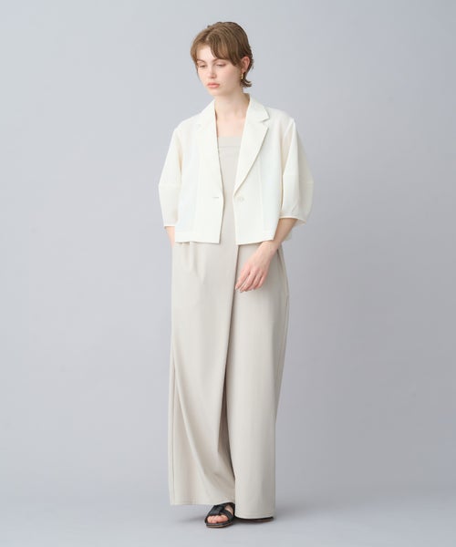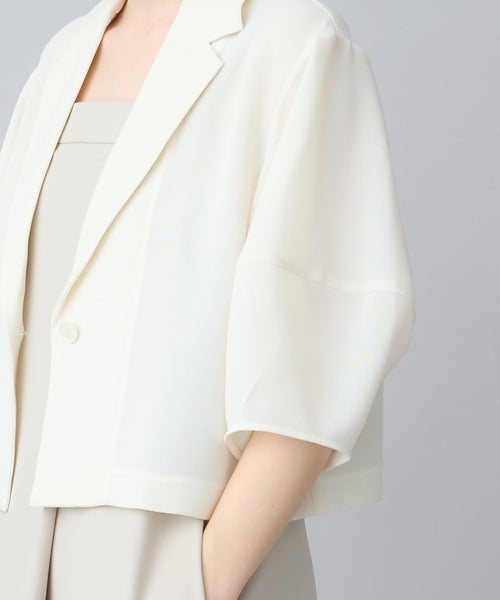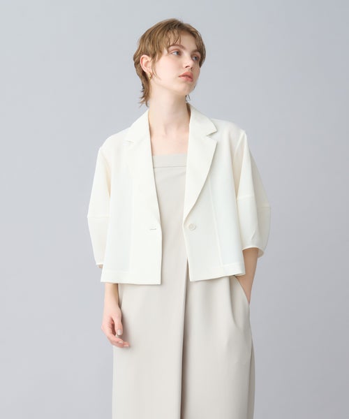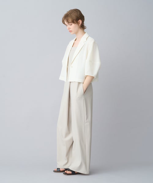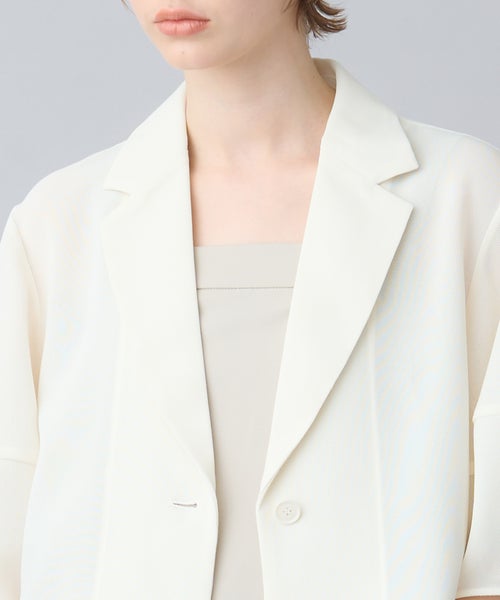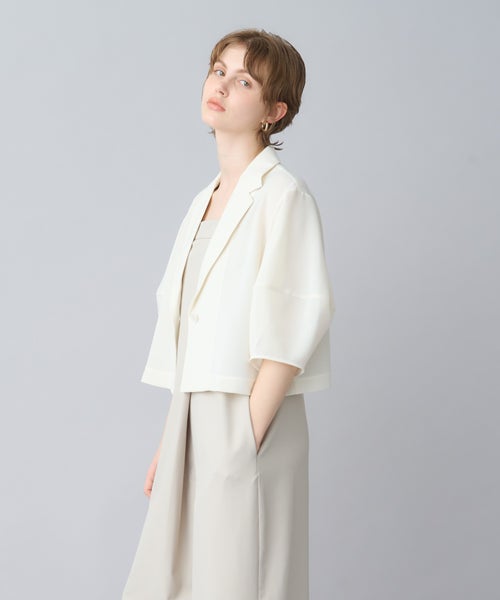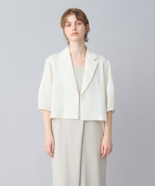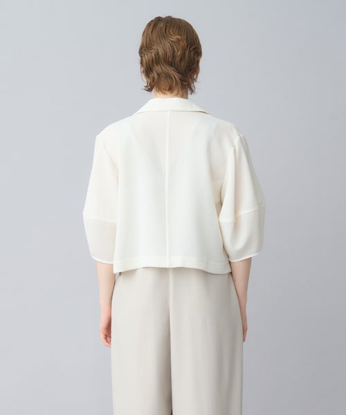 【デザイン】PARIGOT(パリゴ)のジャケット。清涼感のある半袖デザインに、ワイドな身幅とクロップド丈を掛け合わせた、バランスの取りやすい一枚です。程よくボリュームを持たせた袖が立体感を生み、シンプルながらも着映えするシルエットに仕上げています。襟付きでありながら、メッシュ素材によってかっちりしすぎず、ラフに羽織れるのが魅力。コンパクトな丈感はワイドパンツやスカートとも好相性で、スタイルアップ効果も期待できます。Tシャツやタンクトップの上からさらりと羽織るだけで、季節感のある軽やかなスタイリングが完成します。
