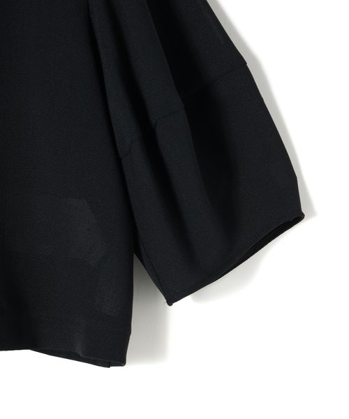 【素材】 梳毛のようなクリンプ形状を持つポリエステル素材を使用。手に取るとシャリっとしたドライなタッチがあり、肌離れが良く、暑い季節でも快適な着心地です。メッシュ構造によって通気性が高く、蒸れにくいのも大きな特徴。見た目はマットで落ち着いた印象ながら、軽やかで涼しげな表情を持ち合わせています。透け感があるため、インナーとのレイヤードで印象の変化も楽しめます。